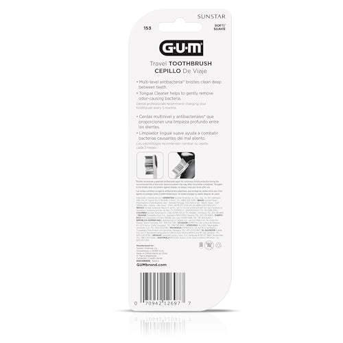 GUM travel toothbrushes come with soft bristles that have been treated with a hygienic solution for sanitary storage between uses. A multi-level bristle layout effectively removes plaque from between the teeth and beneath the gum line.