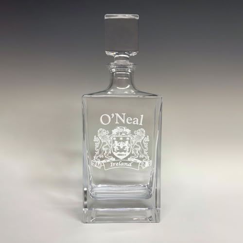 Product description: O'Neal Irish coat of arms deluxe whiskey decanter with coat of arms - sand etched. Celebrate heritage and tradition with our stunning Whiskey Decanter adorned with your Irish Coat of Arms. This timeless piece adds elegance to any setting, making it a perfect gift for special occasions. Expertly crafted from durable, heavy liquor glass, it features a substantial 28.5 oz capacity and a sleek glass stopper lid. The intricate sand-etched design ensures lasting beauty, elevating your whiskey experience with sophistication and charm. Perfect for weddings, groomsmen, reunions, or any special occasion. Authentic Irish coats of arm with over 25 years of heraldry research. Heavy liquor glass decanter and glass stopper lid. Size - 9 1/4"(H) x 4 1/2"(L) x 2 1/2" (W). High quality permanent sand-etching and packaged in a sturdy black gift box with heavy EVA foam for protection.