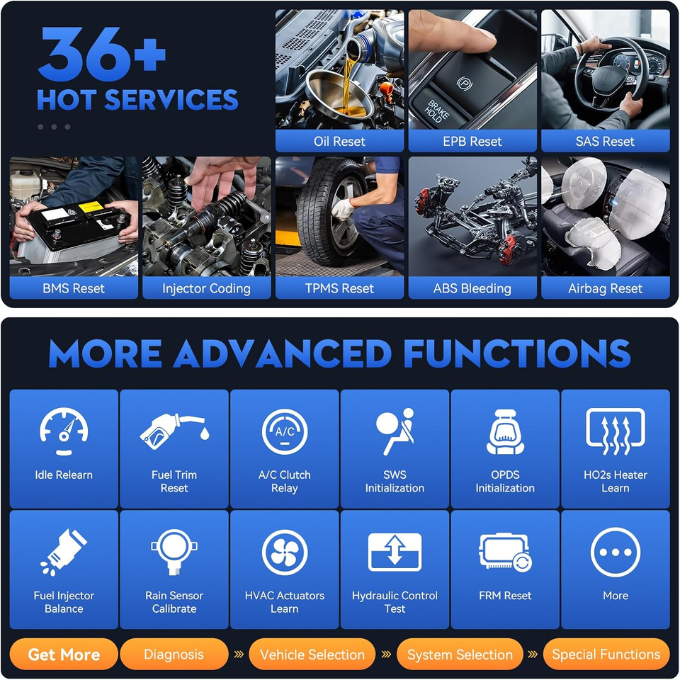 36+ Special Functions: Includes essential maintenance tasks such as Oil Reset, ABS Bleeding, EPB Brake Service, Throttle Body Relearn, TPMS Reset, and Injector Coding to simplify routine upkeep.