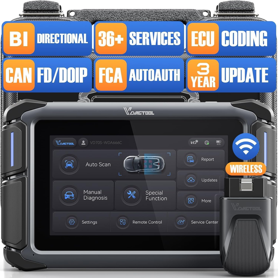 ?HIGH COST-EFFECTIVE SCANNER?VDIAGTOOL VD70S obd2 scanner diagnostic tool has upgraded features and the top tier hardware : ?30X Faster Wireless WiFi Diagnostic, ?Bi-Directional Control, ?36+ Hot Services, ?OE All Systems Diagnostics, ?ECU Coding, ?PMI Function, ?V.A.G Guided Function, ?Advanced Special Functions, ?CAN FD DoIP, ?FCA AutoAuth, ?8-In-One Data Graph, ?3-Year F*ree Update, ?Android 10.0 OS, ?2.4GHz 5GHz dual-band Wi-Fi, ?2+64GB, ?18.25Wh Battery, ?15 Languages, ?100,000+ vehicle coverage to meet all your daily maintenance needs.