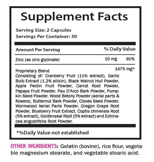ANTI-PARASITE COMPLEX: Our powerful dietary supplement designed to support a balanced internal environment and promote optimal well-being. This advanced formula combines the natural benefits of Cranberry Fruit, Garlic Bulb Extract, Black Walnut Hull Powder, Apple Pectin Fruit Powder, Cloves Seed Powder, Wormwood Aerial Parts Powder, Oregon Grape Root Powder, Blueberry Fruit Extract, Goldenseal Root (5% extract) and Echinacea angustifolia Root Powder with a blend of potent ingredients known for their properties.