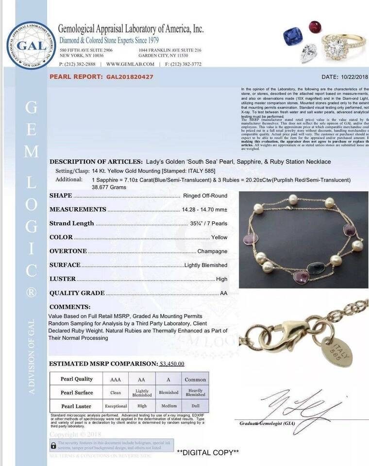 Fine Quality South Sea Pearl Ruby Sapphire Necklace 14k Gold Italy Certified $3,450 820427