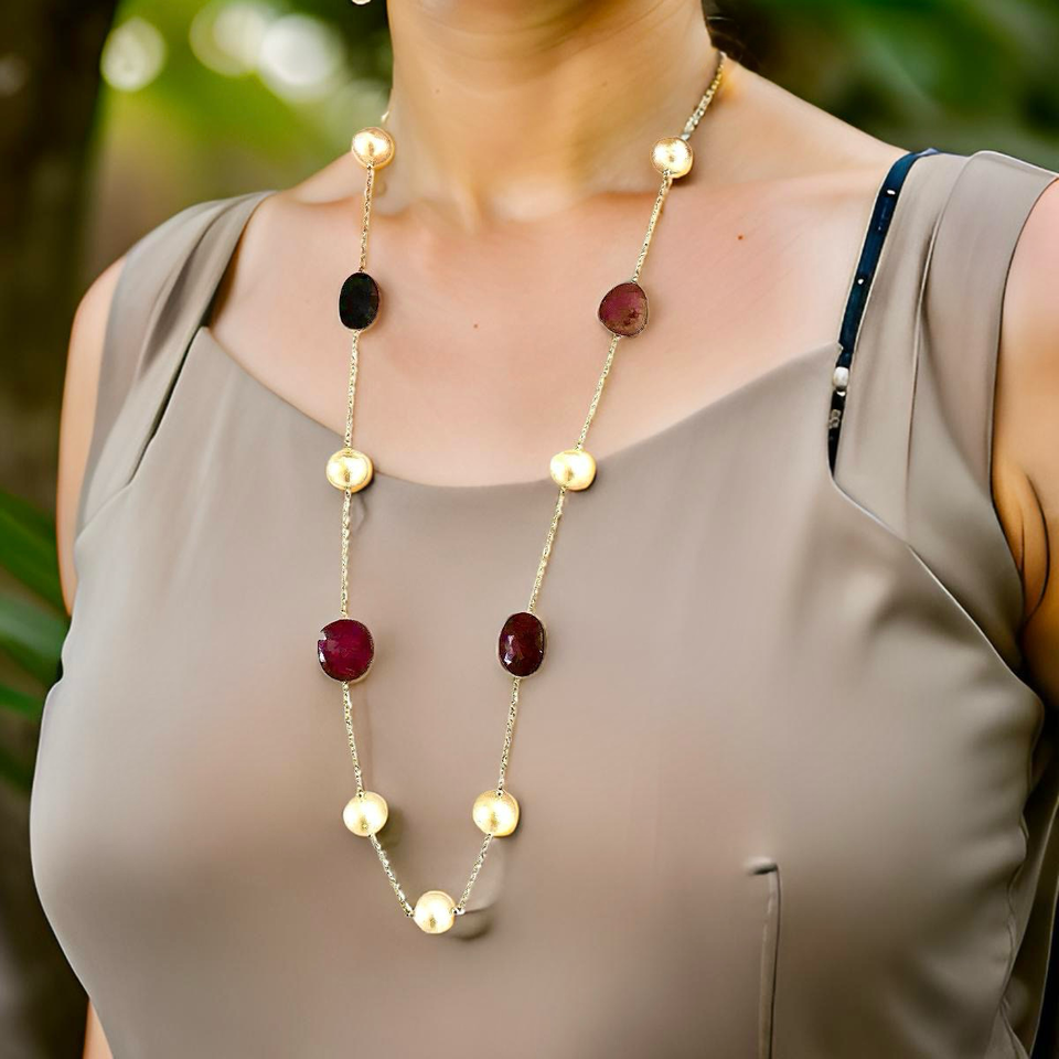 Set in 14k yellow gold, the necklace measures 35.75 inches, giving it an elegant drape and allowing it to be worn long or doubled for versatility.