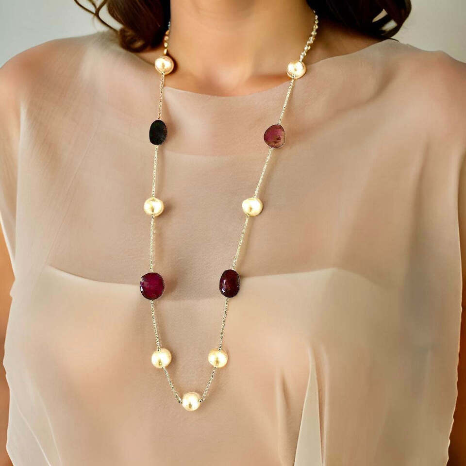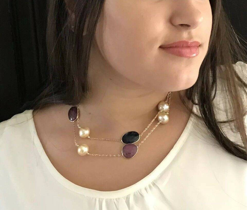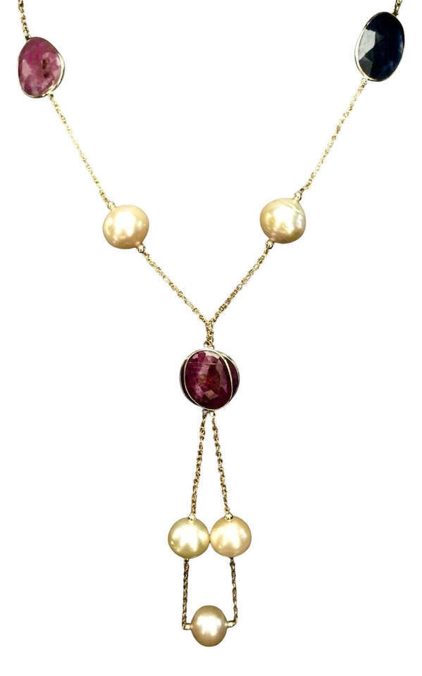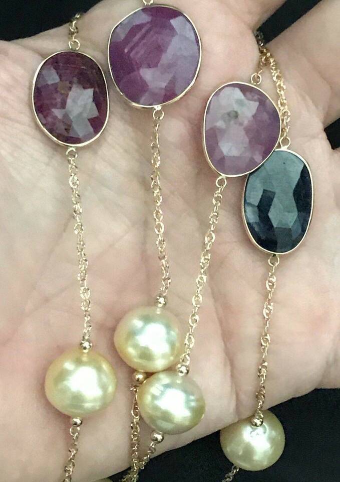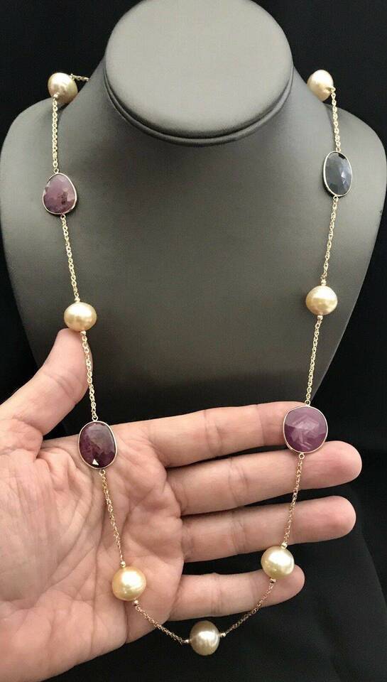 Authenticity Guarantee South Sea Pearl Ruby Sapphire Necklace 14k Gold Italy...
