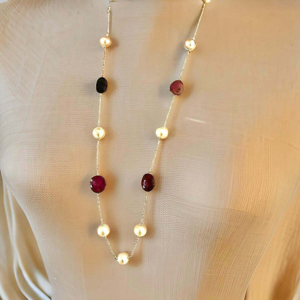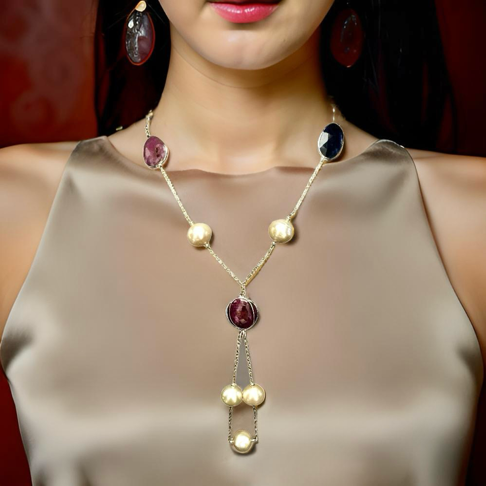 These pearls are interspersed with finely faceted rubies and sapphires totaling 27 carats, adding a stunning array of deep red and blue hues that complement the pearls beautifully.