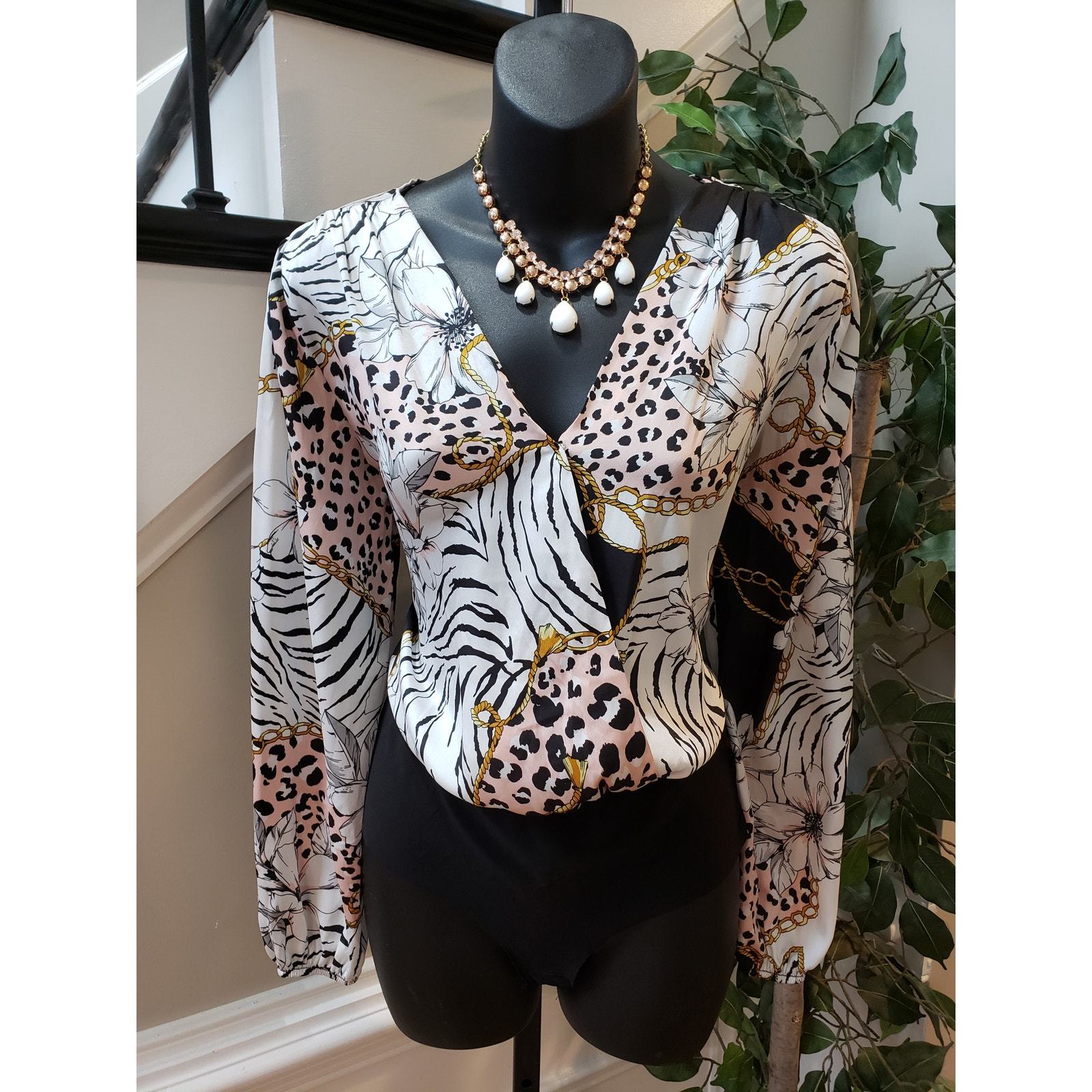 Haute Monde Bodysuit Women's Small Multi Geo Print Polyester Long Sleeve V Neck