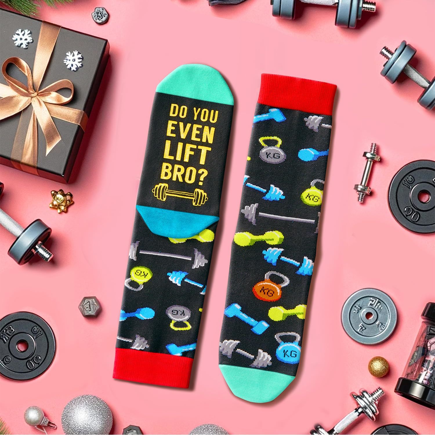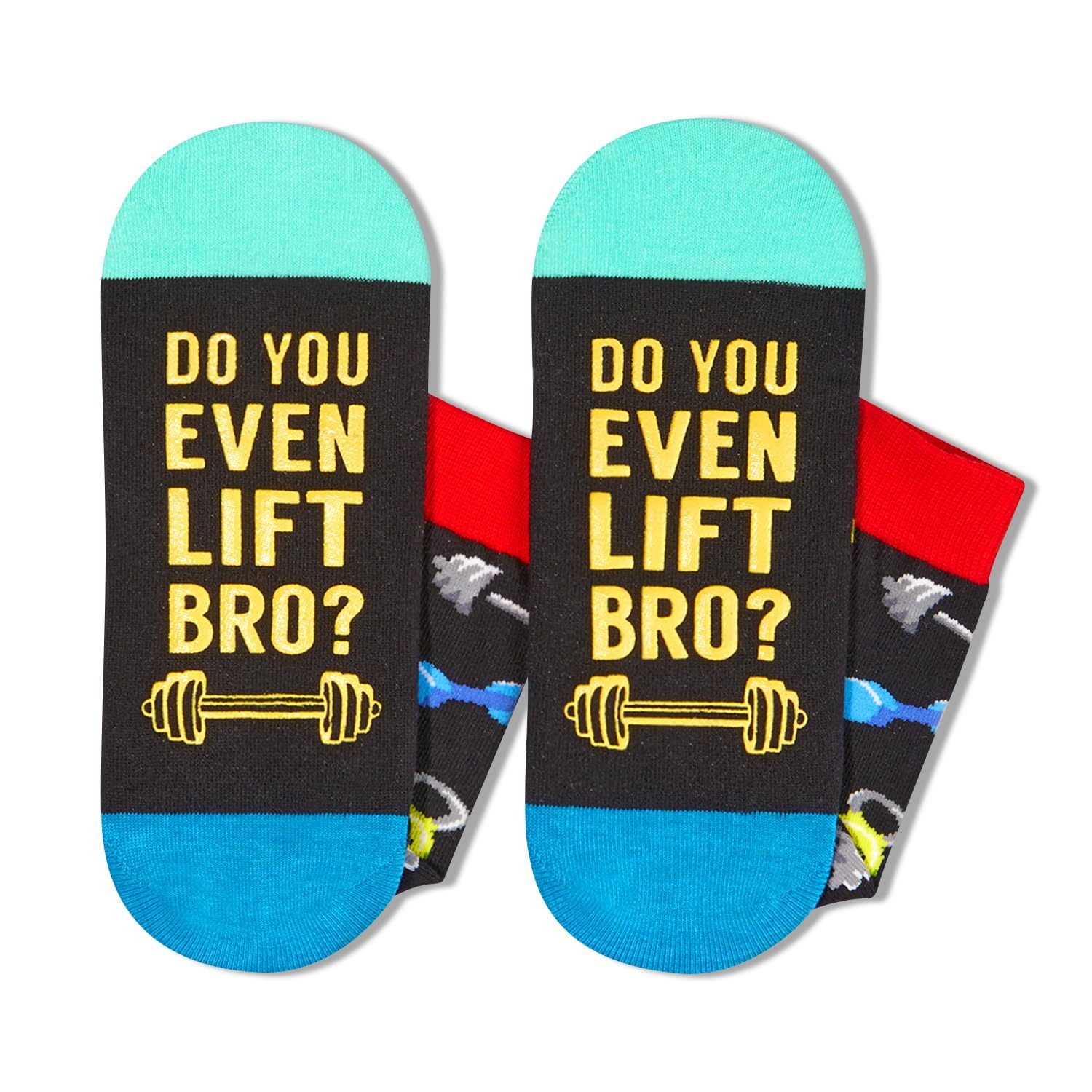 WEIGHT LIFTING GIFTS: These black weight lifting socks feature various dumbbells and exercise equipment, making them one of the best gifts for fitness enthusiasts. They also have a hidden message: "DO YOU EVEN LIFT BRO."