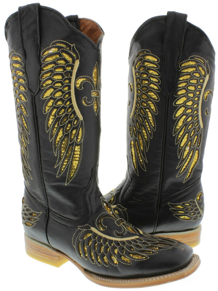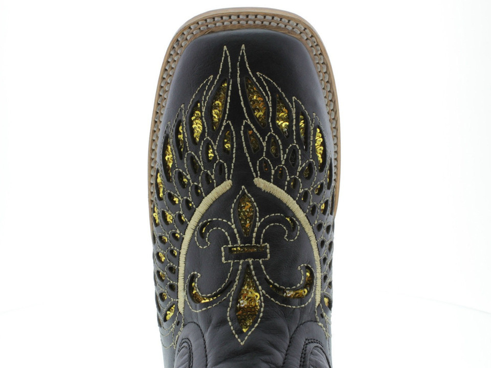Womens Western Boot Black Leather Gold Sequin Fleur-De-Lis Wings Square 5.5, 6.5