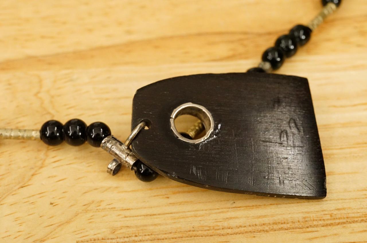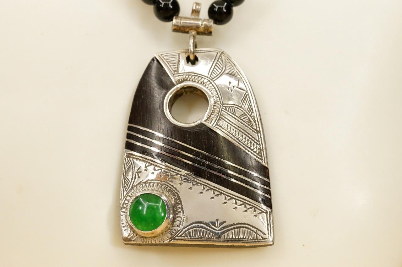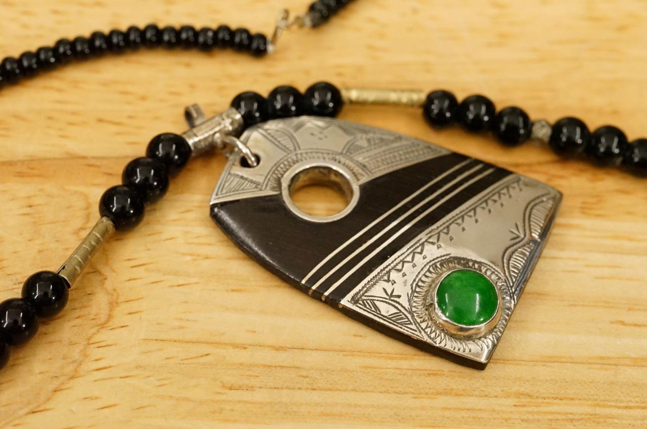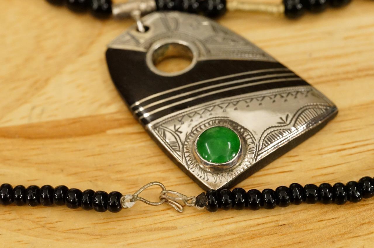 Estate Jewelry Morocco Tuareg Chased Silver Green Agate Onyx Beaded Necklace. The pendant is 2" long, silver metal work on horn. green agate accent. The necklace is 19.5" long. The beads in the necklace and clasp as a base white metal similar to alpaca.