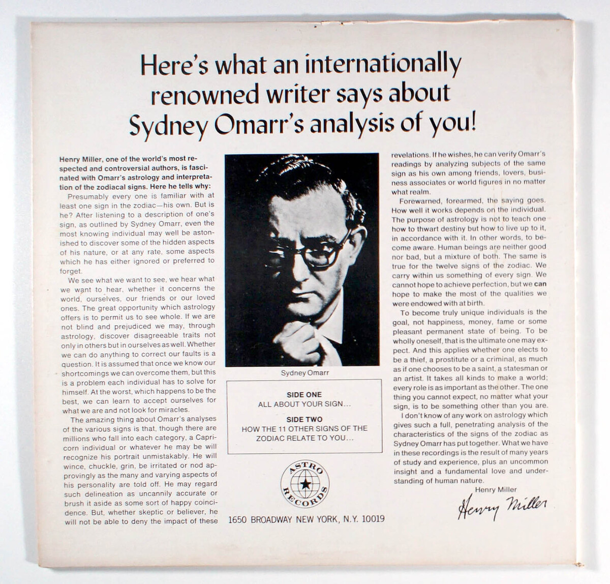 Libra, by Sydney Omarr, is a non-musical spoken word explanation of the horoscope by renowned writer Sydney Omarr. According to Henry Miller in liner notes, "I don't know of any work on astrology which gives such a full, penetrating analysis of the characteristics of the signs of the zodiac as Sydney Omarr has put together.What we have in these recordings is the result of many years of study and experiences plus an uncommon insight and a fundamental love and understanding of human nature."