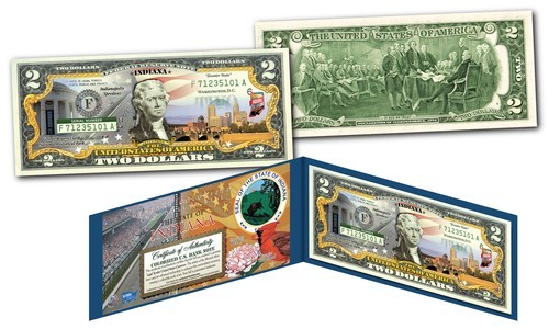Celebrate America with the popularity of the statehood series with these colorized $2 bills. Each bill features the state's name, bird, flower, nickname, emblem, year of admission, and State Quarter graphic. The State Quarter featured on the bill is an actual watermark security feature?the first of its kind! Americans from all over the country are rushing to obtain the new ?Statehood? Genuine Two Dollar bills, while they last. The coveted U.S. Government $2 bill is rarely seen in circulation and only banks and currency dealers may obtain special uncirculated bills directly from the Federal Reserve Bank. Now for the first time ever these enhanced uncirculated full color two dollar bills are available exclusively from this limited time offer. Two dollar bills are among the most beautiful of all U.S. circulating currency and now the rarely circulated $2 bill is even rarer with exclusive overlay of our beautiful States. Each Bill comes with a full-Color Certificate of Authenticity handsomely displayed in a Special Gold Foil Museum-Quality Folio. Don?t Miss Your Chance to Order?.Very Limited Quantity Available!