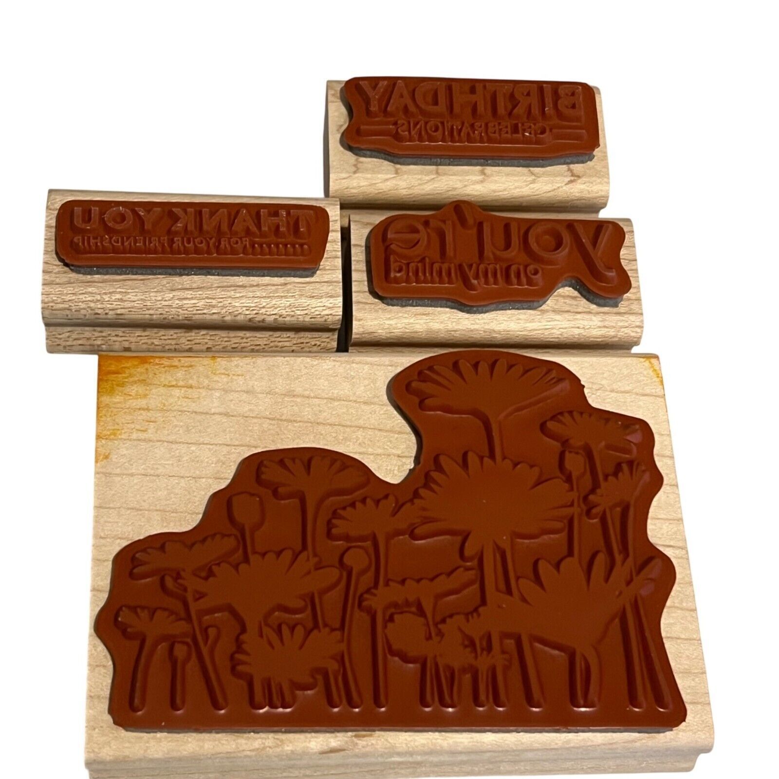 Each stamp has minor wear on wood; rubber surfaces are intact and functional. Largest stamp measures approximately 4 inches wide.