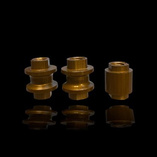 The product is a 3-Pack of Barrel Bushings in Bronze, they are designed specifically for compatibility with the Benchmade Bugout knives. These bushings are precision-engineered and made from billet aluminum, offering enhanced durability and resistance to wear. The anodized finish in dark gold adds a distinctive and stylish accent to your knife. Crafted for a perfect fit, these bushings ensure smooth operation and improved stability of the knife. Ideal for knife enthusiasts looking to customize their Benchmade Bugout with both a unique color and a long-lasting material. Since this is hard coat anodized, the color is stonger and will take longer to show wear.