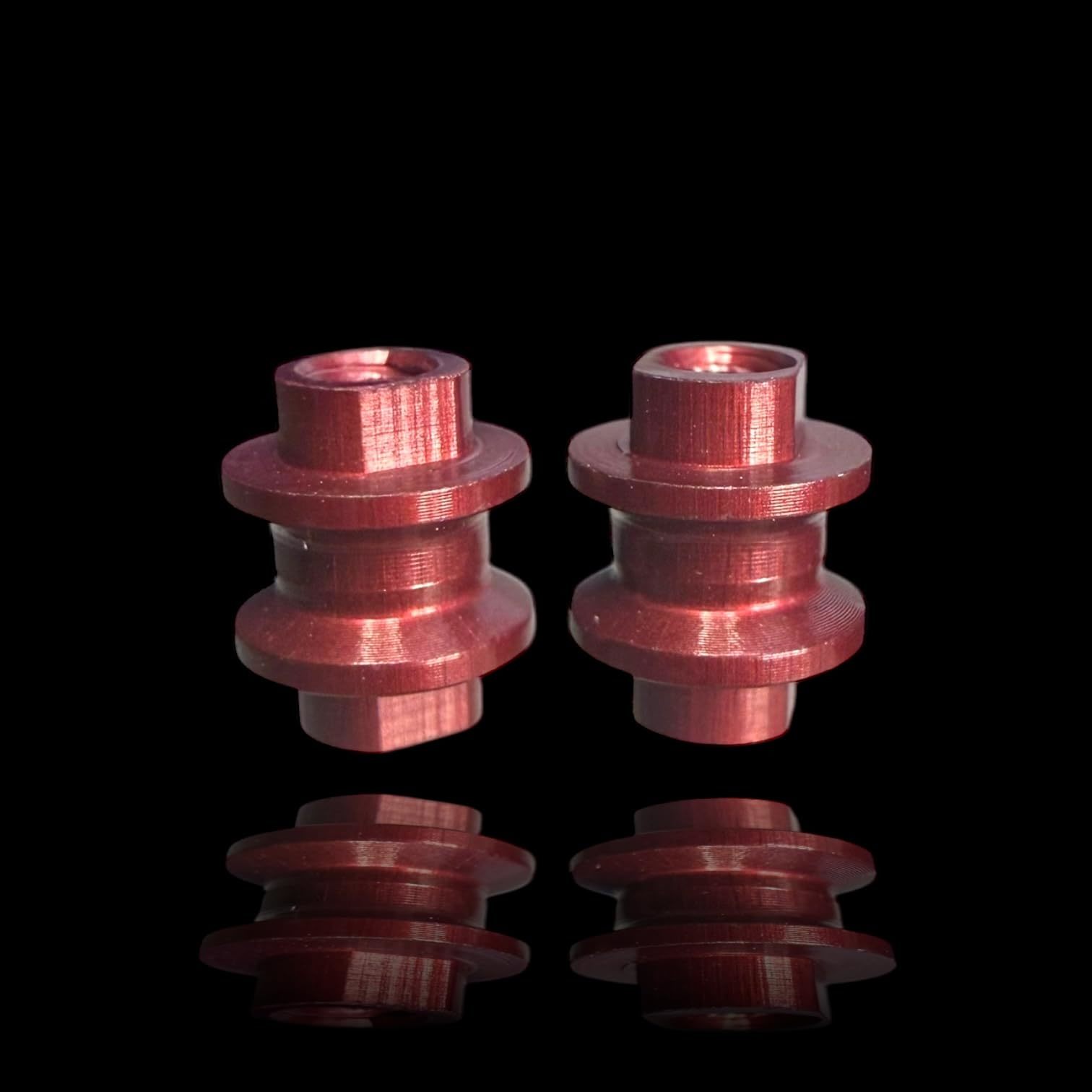 The product is a 2-Pack of a Barrel Bushings in Brandy Red, they are designed specifically for compatibility with the Benchmade Bugout knives. These bushings are precision-engineered and made from billet aluminum, offering enhanced durability and resistance to wear. The anodized finish in red adds a distinctive and stylish accent to your knife. Crafted for a perfect fit, these bushings ensure smooth operation and improved stability of the knife. Ideal for knife enthusiasts looking to customize their Benchmade Bugout with both a unique color and a long-lasting material. Since this is hard coat anodized, the color is stronger and will take longer to wear.