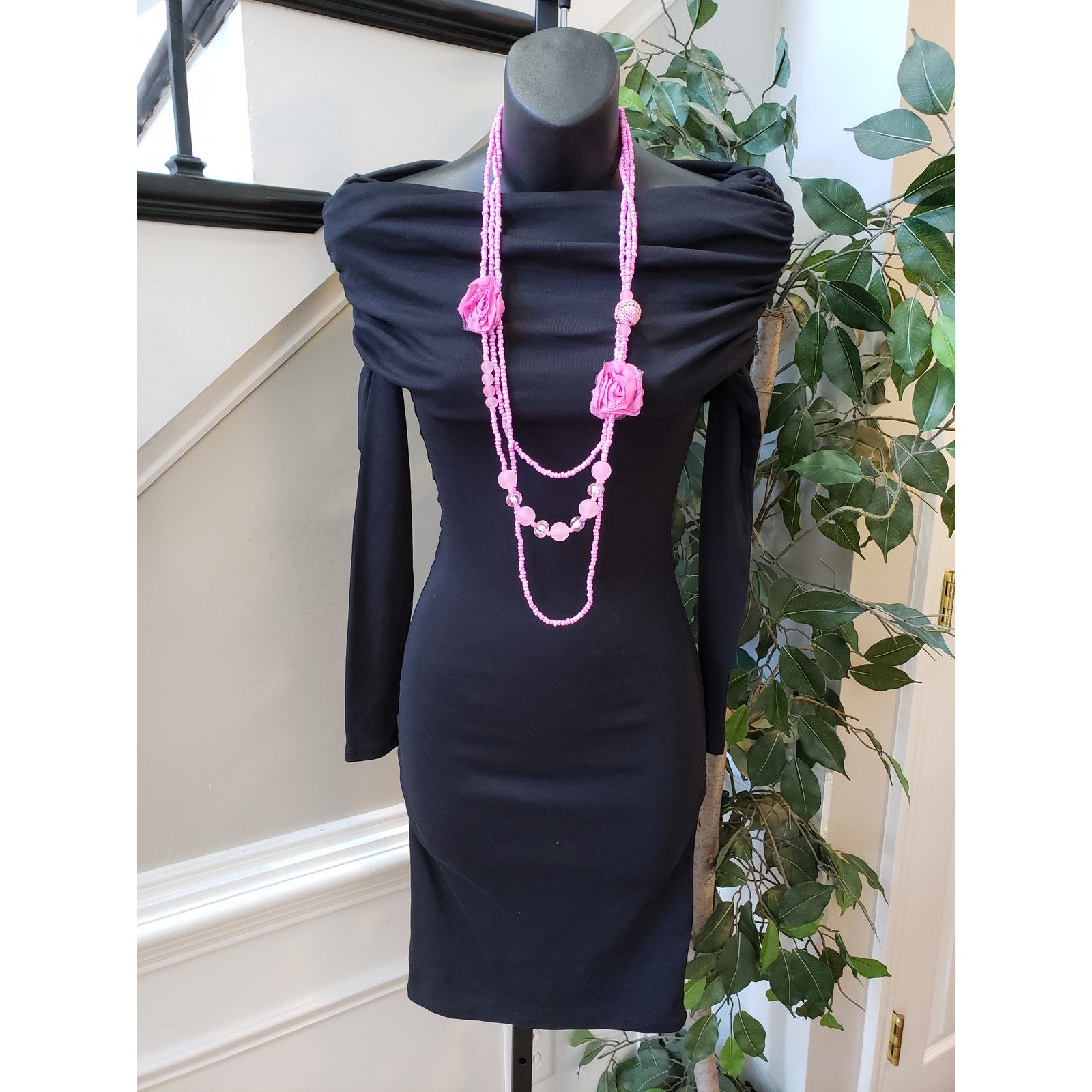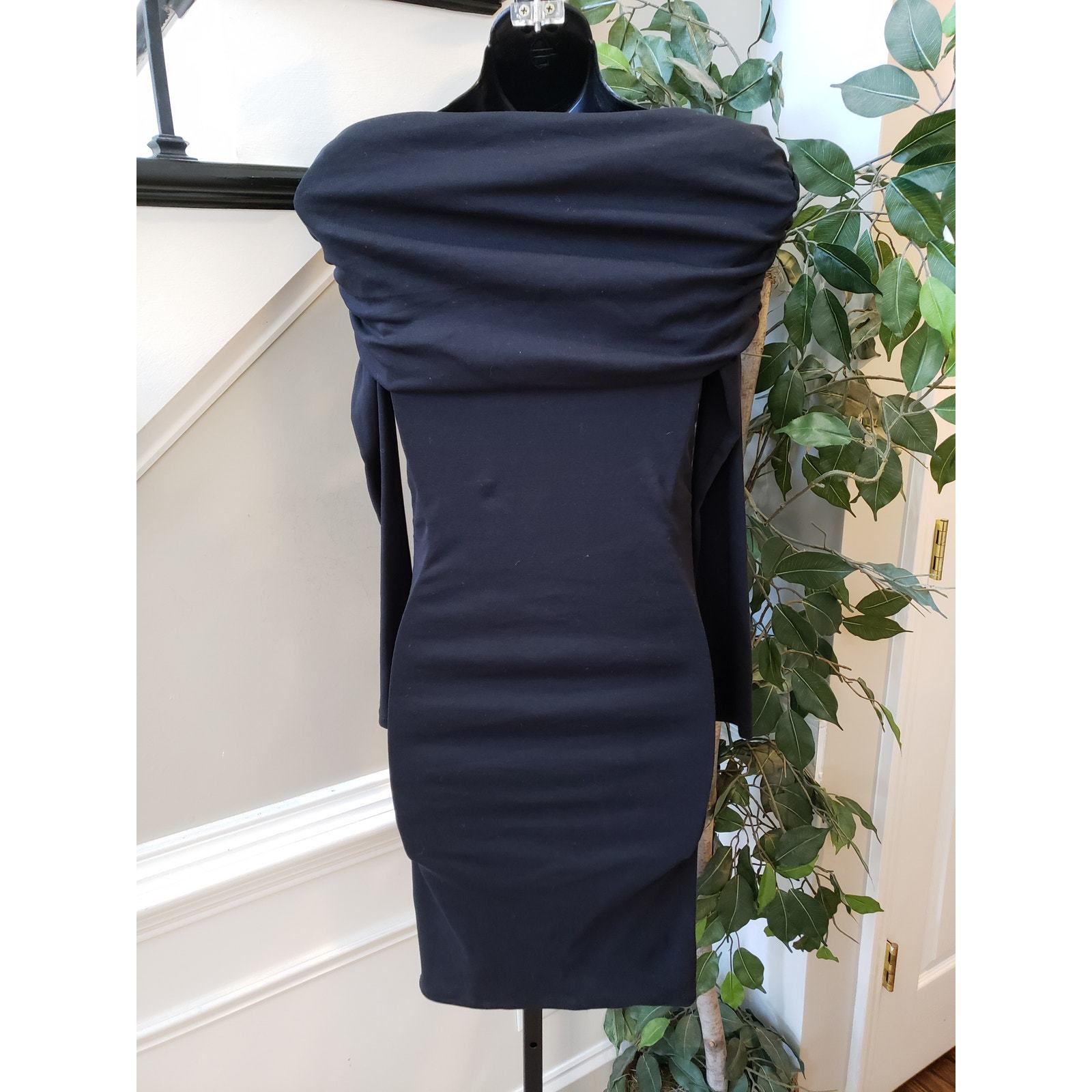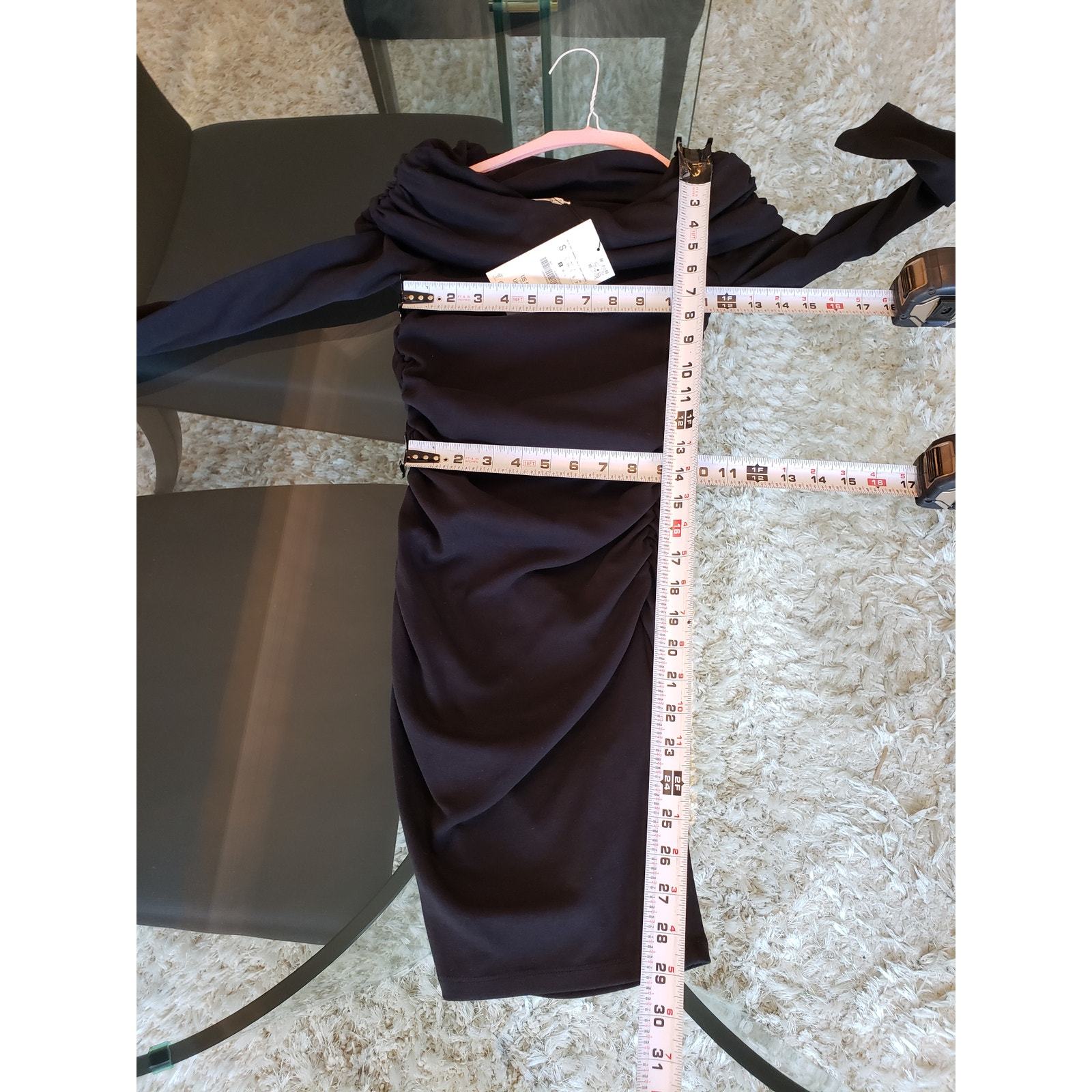 Zara Fit & Flare Dress Women's Size Small Black Solid Stretch Ruched Long Sleeve