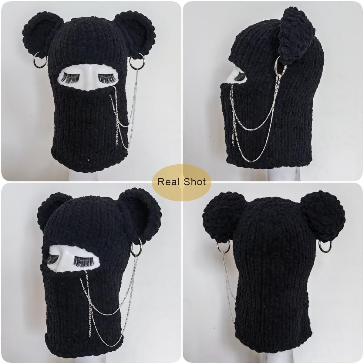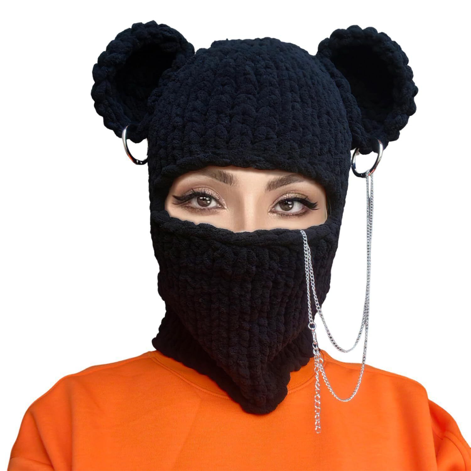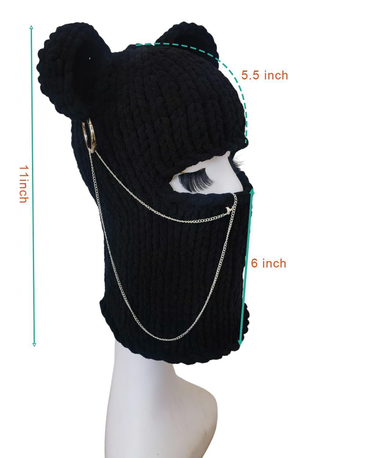 Color: Black BearFeatures: Accessories: Our AWINGGILA's bear ear mask has Ears and Chain accessories as pictured. Soft and Comfortable Material: This knitted face cover is fully handmade product by thick yarn, soft and fluffy, provides excellent insulation to keep your face, neck, and ears warm and protection in cold winter weather. Unique Animal Ear Design: Featuring a cute bear ear design, this balaclava hat adds a fun and playful touch to your winter outfits. Multi-Purpose and Versatile: This knit crochet balaclava hat is perfect for birthday parties, Halloween, Christmas parties, and other festive occasions. As well as a wide range of outdoor activities, such as cycling, snowboarding, skiing, hiking, and more. Cleaning Tips: This face mask is hand wash only and easy to maintain. The Ear can Stand Up: The bear ear part of this hat is crocheted after our improvement, now it is bigger, more cute, and can stand up sturdy on the hat. Details: Description Product Style: Funny Crochet Bunny Ear Bear Ear Cat Ear Hat Beanie Hat, Ski Beanie Material: Double knitting wool Target Audience: Youth (15-35 years old) Color: As Shown Includes: 1*Crochet Hat, include accessories Notes: Due to the different display and lighting effects, the actual color of the item may be slightly different from the color displayed in the picture.Package Dimensions: 10.6 x 7.8 x 2.4 inches