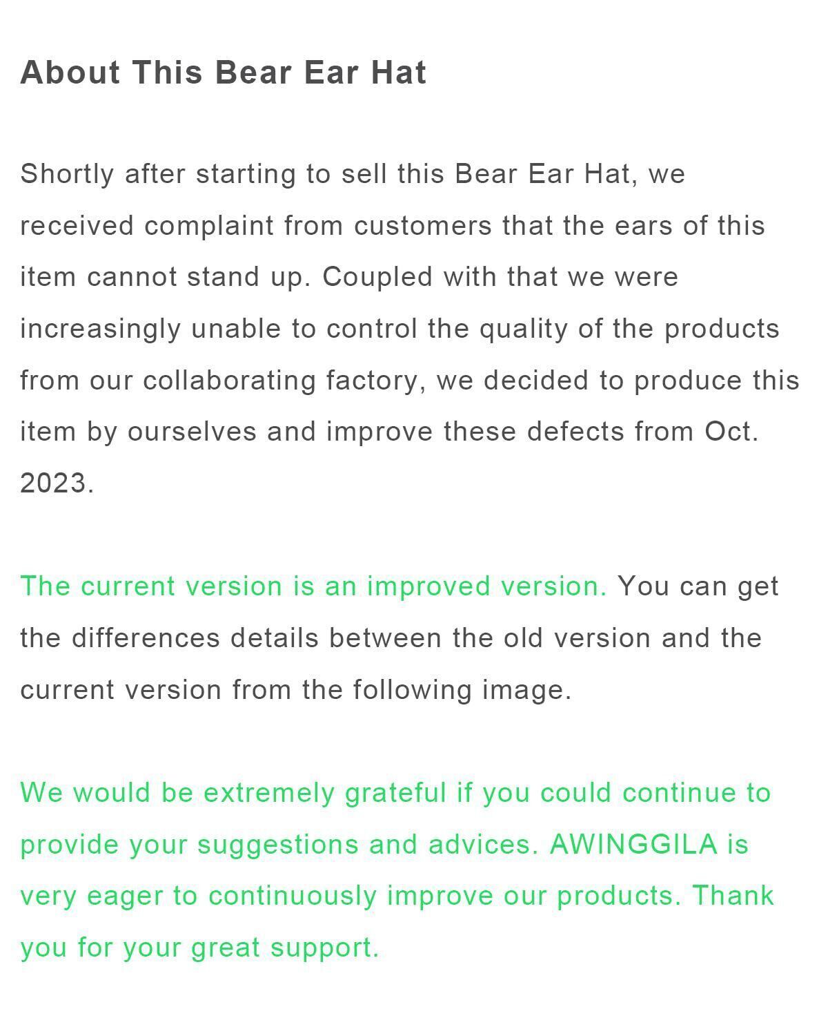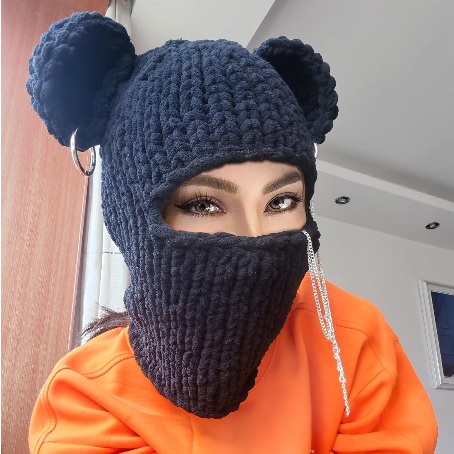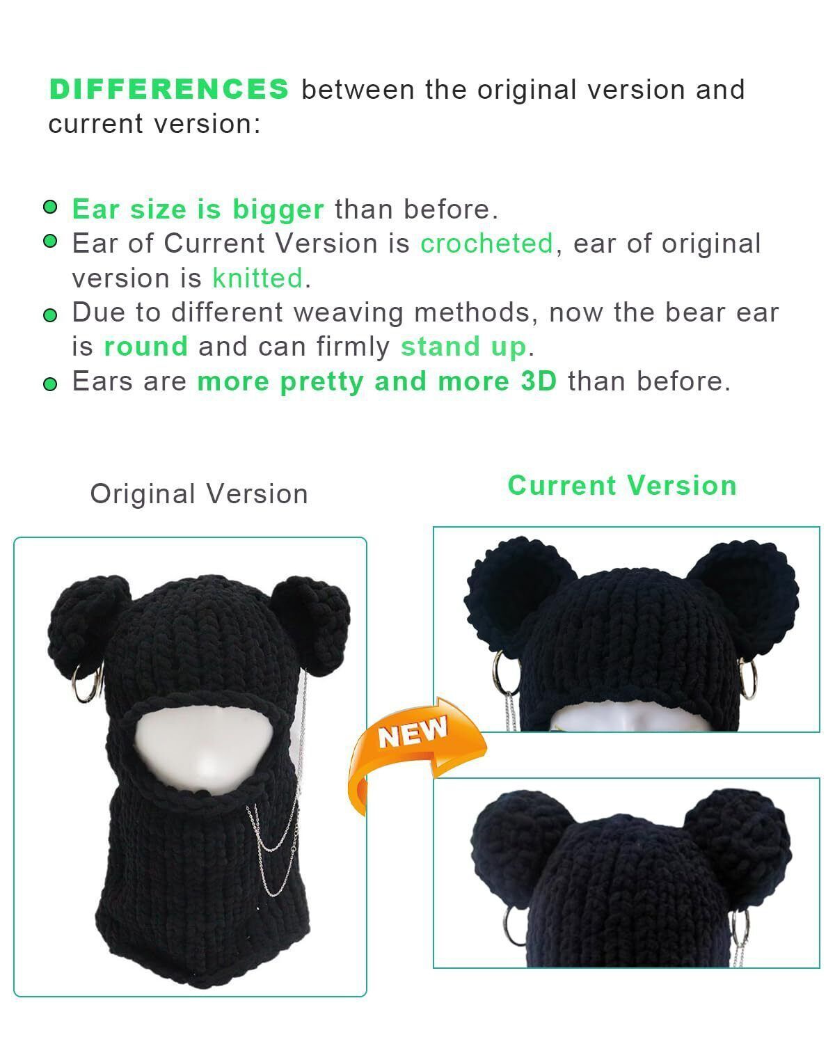 Color: Black BearFeatures: Accessories: Our AWINGGILA's bear ear mask has Ears and Chain accessories as pictured. Soft and Comfortable Material: This knitted face cover is fully handmade product by thick yarn, soft and fluffy, provides excellent insulation to keep your face, neck, and ears warm and protection in cold winter weather. Unique Animal Ear Design: Featuring a cute bear ear design, this balaclava hat adds a fun and playful touch to your winter outfits. Multi-Purpose and Versatile: This knit crochet balaclava hat is perfect for birthday parties, Halloween, Christmas parties, and other festive occasions. As well as a wide range of outdoor activities, such as cycling, snowboarding, skiing, hiking, and more. Cleaning Tips: This face mask is hand wash only and easy to maintain. The Ear can Stand Up: The bear ear part of this hat is crocheted after our improvement, now it is bigger, more cute, and can stand up sturdy on the hat. Details: Description Product Style: Funny Crochet Bunny Ear Bear Ear Cat Ear Hat Beanie Hat, Ski Beanie Material: Double knitting wool Target Audience: Youth (15-35 years old) Color: As Shown Includes: 1*Crochet Hat, include accessories Notes: Due to the different display and lighting effects, the actual color of the item may be slightly different from the color displayed in the picture.Package Dimensions: 10.6 x 7.8 x 2.4 inches