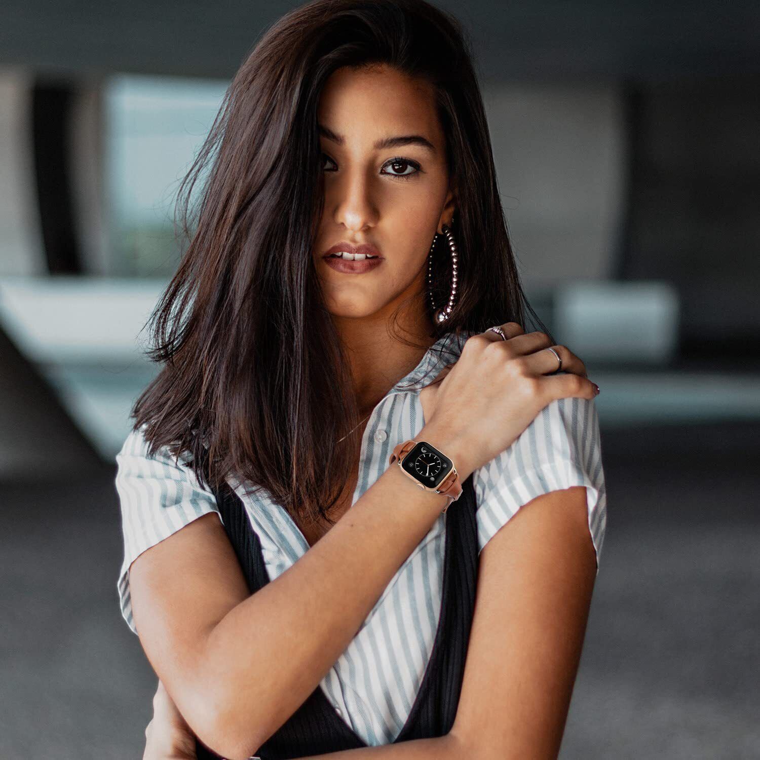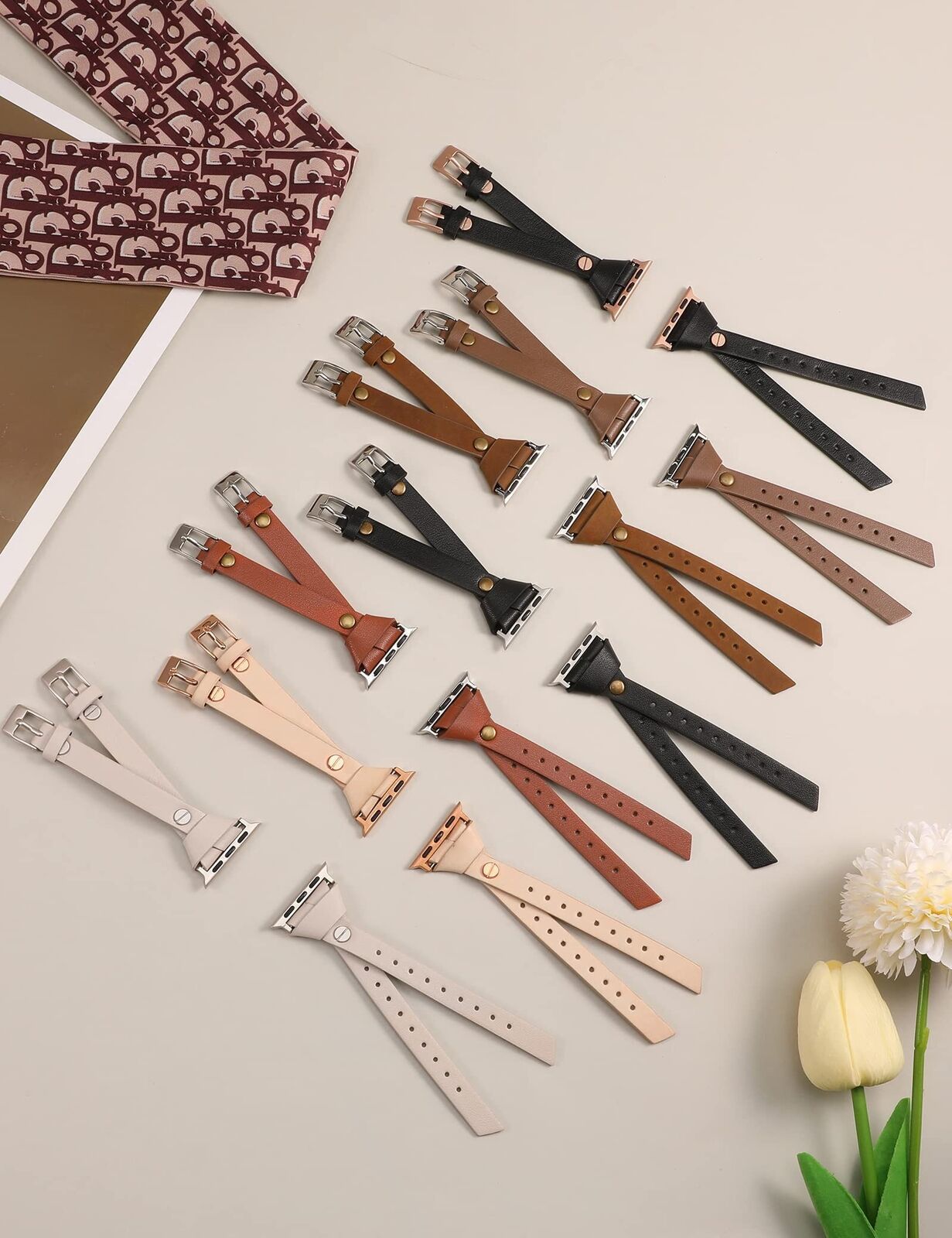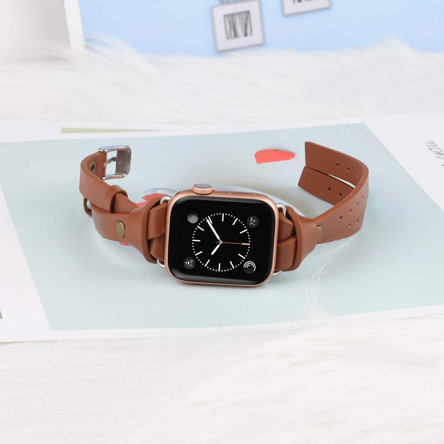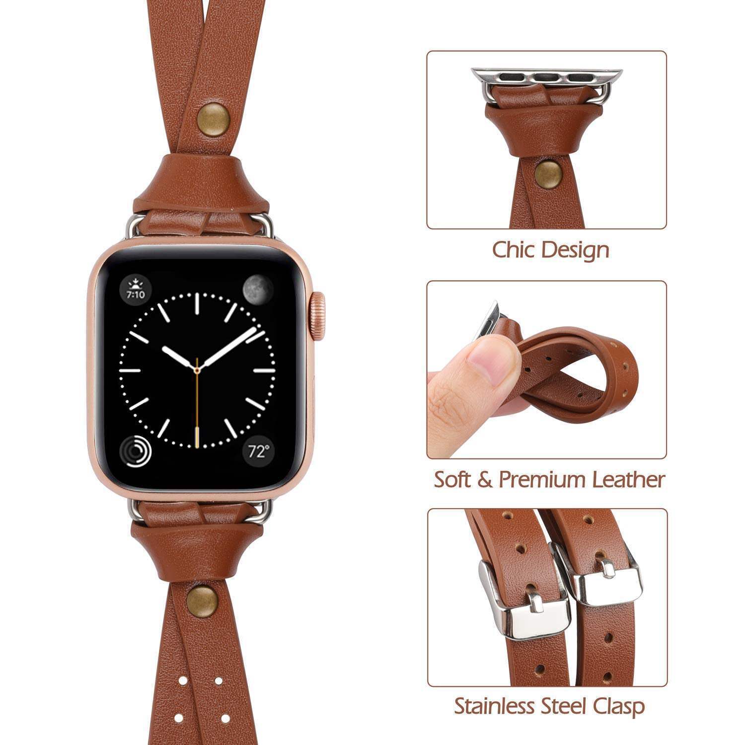 Color: Light BrownFeatures: Unique Chic Design: Exclusive double-breasted, classical knotted with bronze rivet, Its unique shape makes it stand out from traditional bands. An elegant, stylish and cute look for anyone looking for a unique band. Wear it, Receive compliments! Superior Quality: Premium leather with fashionable craftsmanship. Anti-slip, durable, comfortable, breathable and has no peculiar smell. Lightweight on the wrist only: 0.6oz (18g) Compatible Models: The vintage leather watch bands women compatible with Apple Watch fit different sizes wrist. 38/40/41/42mm(Series 10) fits the wrist size 5.3"-7.7"(135-195mm), 49/46/45/44/42mm(Seires 3) fits the wrist size 5.3"-7.9" (135-200mm). Compatible with Apple Watch Ultra 1/2(49mm), Series 10 (42mm 46mm), Series 9/8/7(41mm/45mm), Series SE/6/5/4(40mm/44mm), Series 3/2/1(38mm/42mm)all Model Secure Metal Connectors: The V-shape leather watch band for women comes with metal connectors and metal clasps on each end to lock the watch firmly on the wrist and prevent it from falling off and scratching. Different color connectors and clasps can also better match your watch and bring a more unique style Great Gift Choice: The Minyee designer stylish leather apple watch band is a great gift for yourself or your families, friends. It's chic design will bring you and your friends a ton of compliments, the best gift to give on Women's Day, Mother's Day, Thanksgiving, Valentine's Day, Christmas, New Year Package Dimensions: 7.1 x 4.2 x 0.6 inches