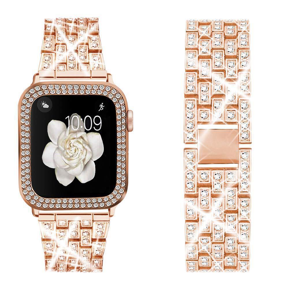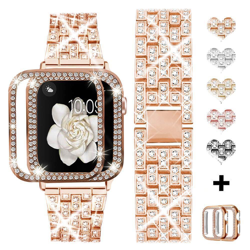 Color: Rose gold+case+caseFeatures: Compatibility : [3-pack] Compatible for Apple Watch band 40mm with Rhinestone Protective Cover,Women 1pack Bling Diamond Metal Strap with 2 pack Soft PC screen Protector Case for iWatch Series 6/5/4/SE. Easy to Adjust:Comes with a resizing tool to adjust the length of the band; You could easily remove the extra links to fit your wrist perfectly,high-performance metal, well polished, making it a great gift for iWatch lovers as Christmas decorations, Thanksgiving decorations. Unique Design:Made of premium metal material with shinny rhinestones decoration, well polished, no sharp edges, water/sweat-proof, robust to use. The PC case is made of premium polycarbonate, no deformation and discoloration, protects the Watch and around edges from shocks or scratches. Includes: 1-pack iwatch band+2 pack bling case+product manual,high quality case and watch band for the iWatch,the replacement of watch band and screen protector. The bling replacement wristband for women men to personalize your smartwatch and fit your mood, outfit in daily life, dress up your watch/iwatch/smartwatch band and highlight your unique taste. Package Dimensions: 9.6 x 2.4 x 0.6 inches