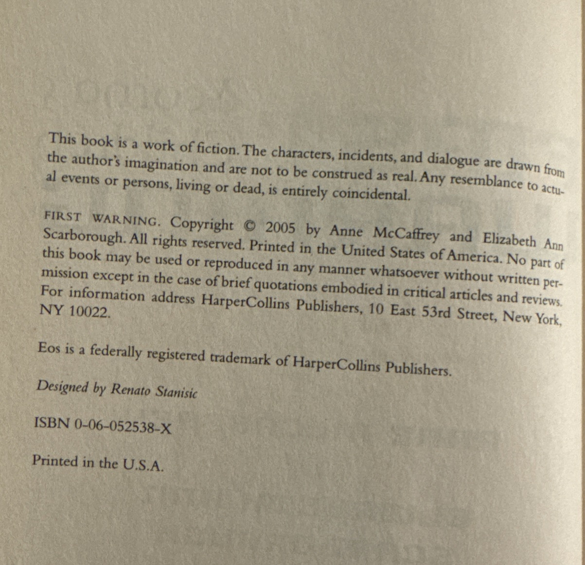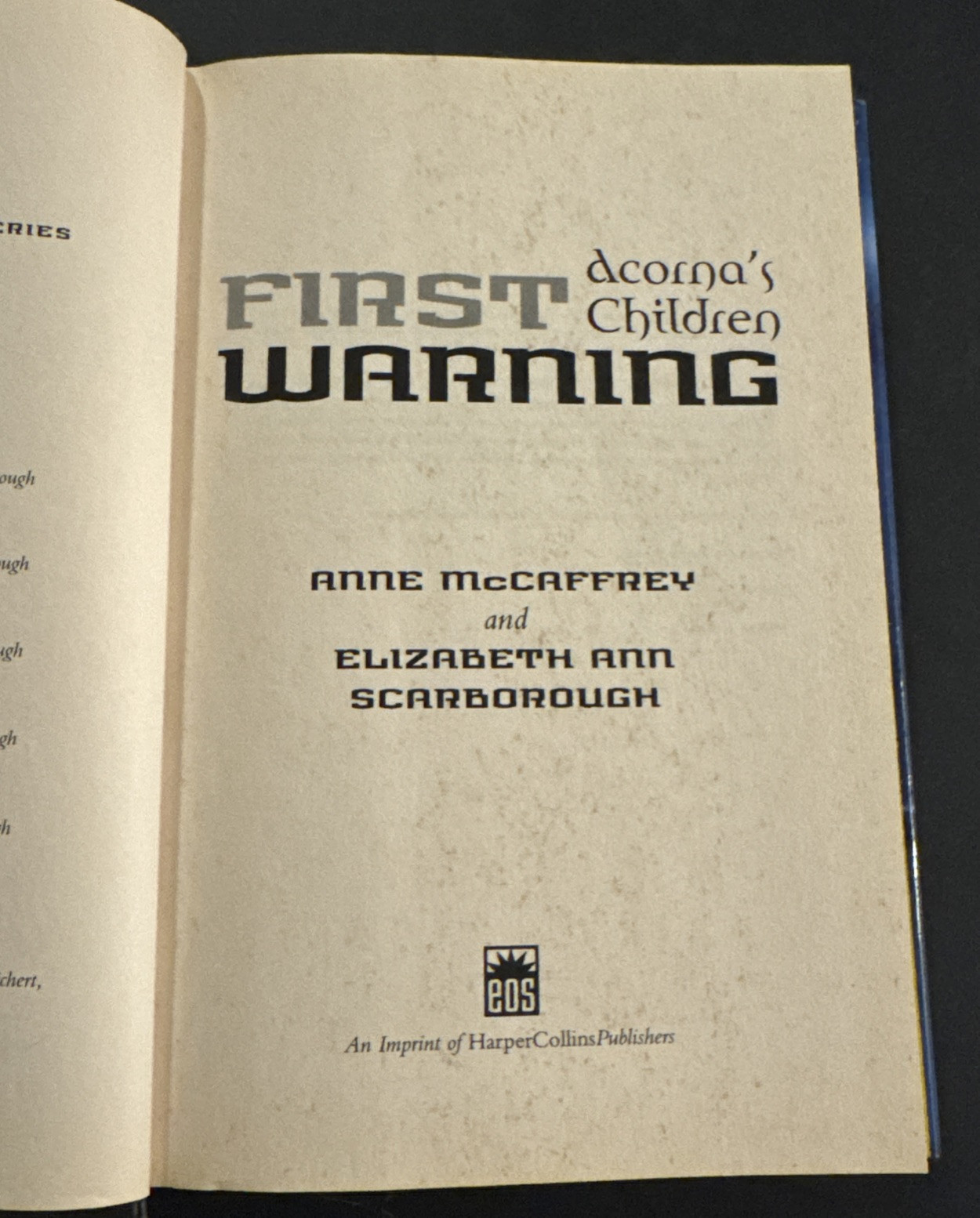 The product is a hardcover novel titled "First Warning: Acorna's Children" by authors Anne McCaffrey and Elizabeth A. Scarborough. Published by HarperCollins The Limited in 2005, the book is part of the Acorna's Children series and falls under the genres of science fiction, fantasy, and family life. With 304 pages, the book is aimed at a wide audience including young adults and adults, featuring a narrative that combines elements of both fiction and fantasy. The novel includes a dust jacket and is written in English.Very good: The book does not look new and has been read but is in excellent condition. There is no obvious damage to the cover the dust jacket (if applicable) is included for hard covers. There are no missing or damaged pages, no creases or tears, and no underlining/highlighting of text or writing in the margins. It may have very minimal identifying marks on the inside cover as well as very minimal wear and tear. Please look at our store for unique collectibles and quality vintage items.