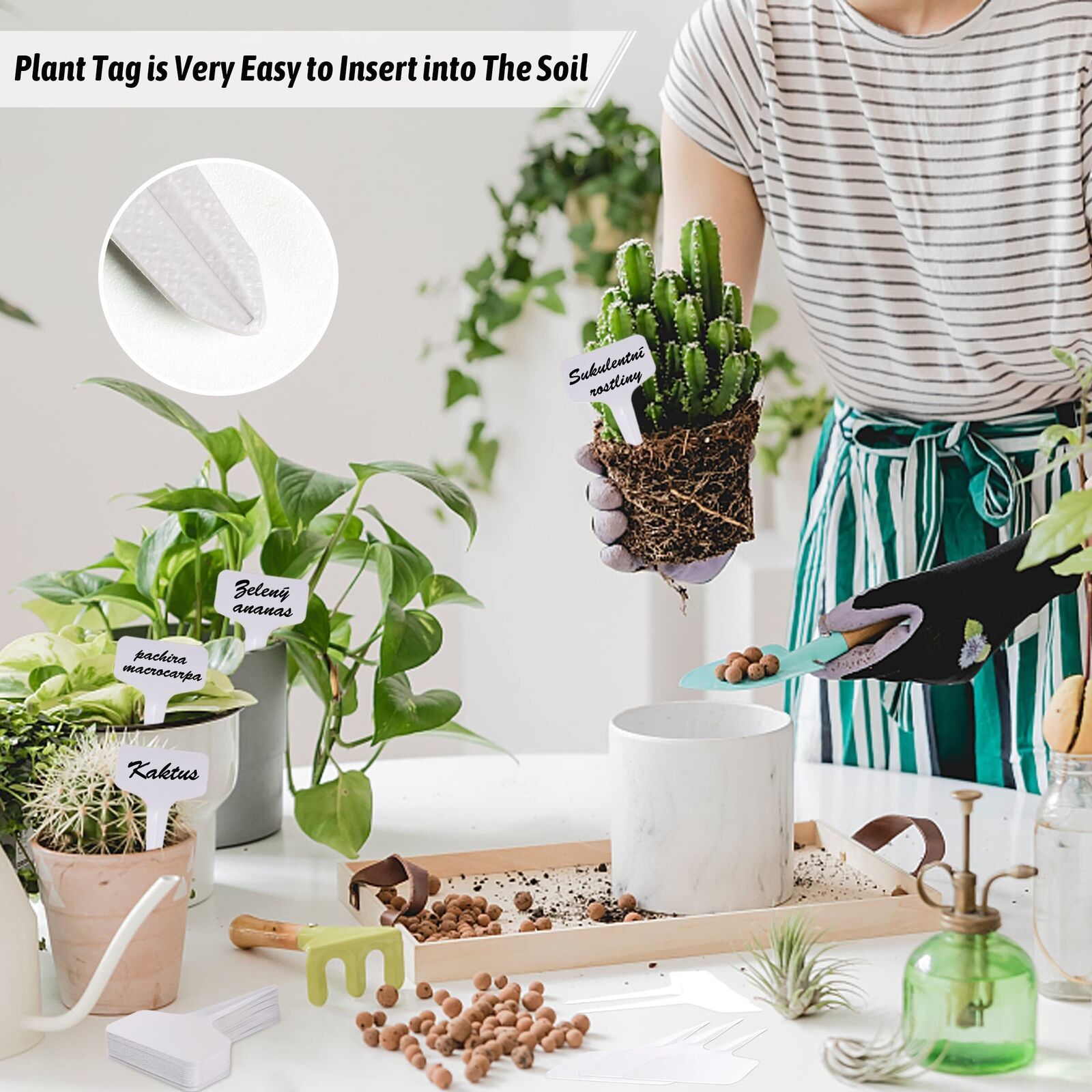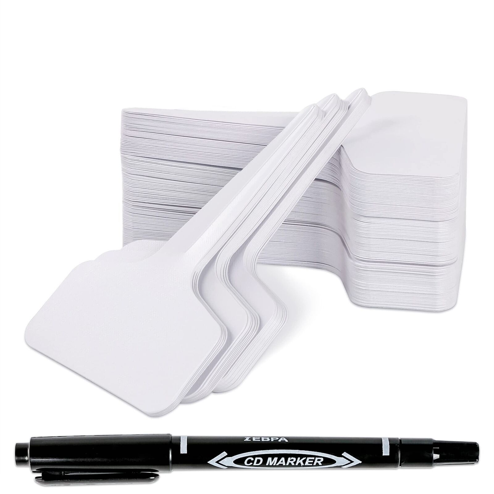 Color: WhiteFeatures: ?Great Value Pack?:Our plant labels pack include 200 pcs white plastic plant tags 4 x 2.4 Inches (10x 6cm) with a bonus permanent marking pen. Enough plant markers can meet your different needs and white plant name tags will make plant header look clearer. ?Premium Waterproof Material?:These plant labels markers are made of premium PVC plastic with water resistance, reusable and smooth edge without injuring plants and hands. The garden labels won't rust like metal tags or rot like wooden labels, not easy to break and brittle. ?T-Type Design Easy to Use?:T-shaped design of plant tags are more convenient to insert into the soil and won't cause harm to the roots of plants. Meanwhile, they are also give you a plenty of space to name your plants and you can easily cleaned with household cleaner or alcohol swab for reuse. ?Enough Space to Mark?: Plant labels tags both side are blank, you can write on any side, matte surface easy to write on the plant labels to record the growth of the plants or flowers. With the bonus permanent marking pen, the ink on the plant label will not easy to be washed away by rain, or fade in the sunlight. ?Wide Application?:The plant labels for outdoor garden waterproof can be used to write cultivar name, plant names. They really help you remind what is where, perfect for vegetable seedlings, greenhouses, gardening project, outdoor potted plants, gardens, fruit trees, flowers etc. ?Great Present for Gardener?:These plastic plant tags and labels can not only let you quickly know what kind of plant it is or its grow situation, but also decorate your garden to make it look more charming. What's more, the garden tags can be a good present choice for friends and family who love gardening. Package Dimensions: 9.8 x 4.6 x 0.8 inches