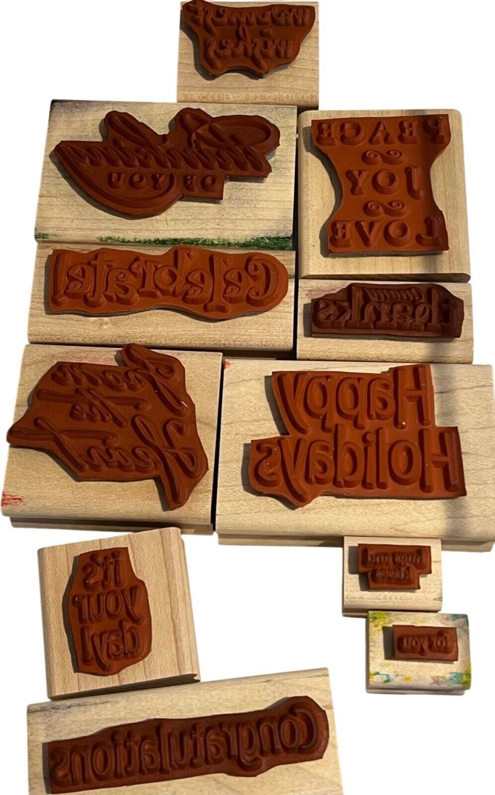 Versatile set for crafting, scrapbooking, and card-making. Includes 11 unique designs for various occasions, made with durable wood and rubber.