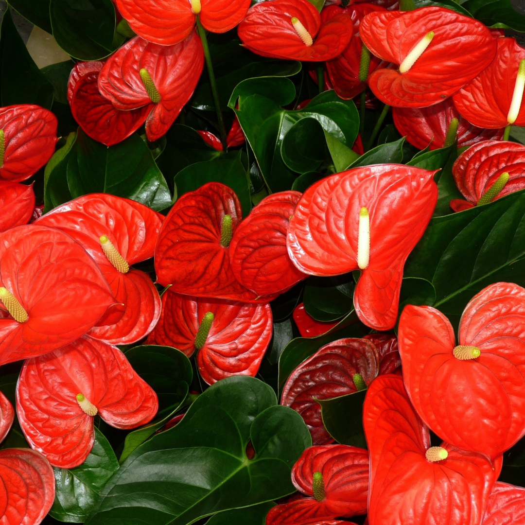- Long-lasting, heart-shaped flowers with a vibrant, deep red color and a waxy, velvety texture
