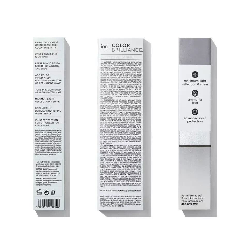 ion Color Brilliance Intensive Shine Demi Permanent Creme Hair Color is a state-of-the-art European Ionic Formula that is a luxurious, long-lasting, deposit-only hair color without ammonia. This hair color covers and blends gray hair up to 100% without lifting the hair's natural pigment. The formula will allow same-day color with chemical relaxers and permanent waves. ion Hair Color?s superior quality, proprietary blends are formulated in Italy by our expert team of chemists to deliver unparalleled results. Our unique system combines the finest quality natural and exotic ingredients with powerful high-tech compounds to achieve exquisite, brilliant color with superior gray coverage. ion Hair Color science relies on the power of micro-pigmentation?our microscopic pigment molecules oxidize slower, allowing them to penetrate deep into the cortex of each hair strand for long-lasting, fade-resistant color.