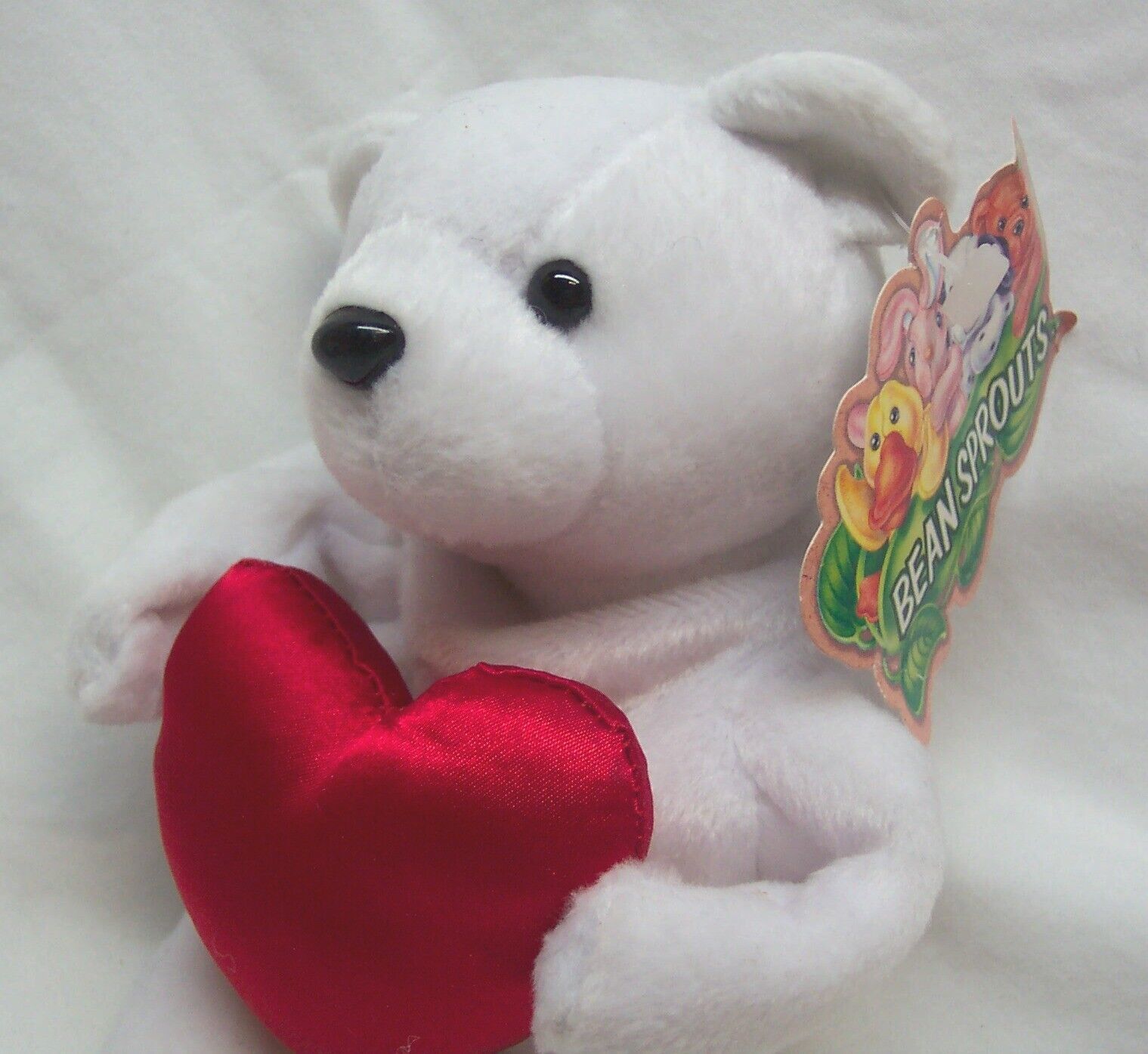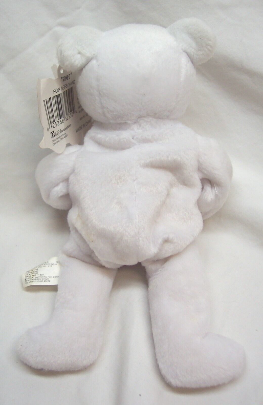 This is a Vintage Bean Sprouts WHITE ROMEO TEDDY BEAR W/ HEART Bean Bag Stuffed Animal Toy. Made by Great American Fun Corp. It is 8 1/2 inches tall. It is in great condition with the tag, but the tag has creases. It is CLEAN! No Stains, or Tears. See picture for details. Combine auctions to save on shipping. Please contact me if you need to make other payment arrangements EAG