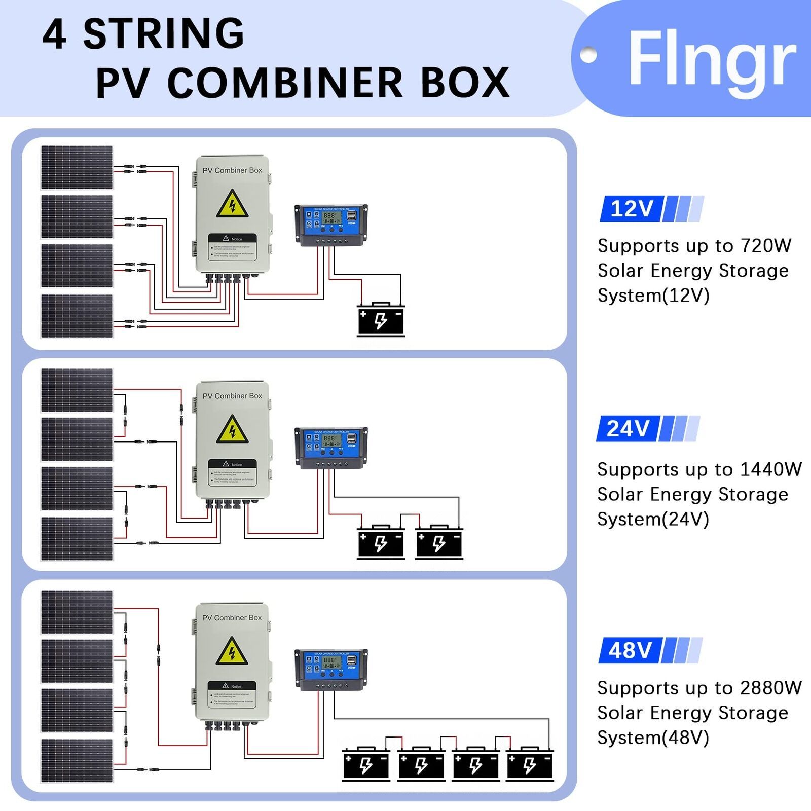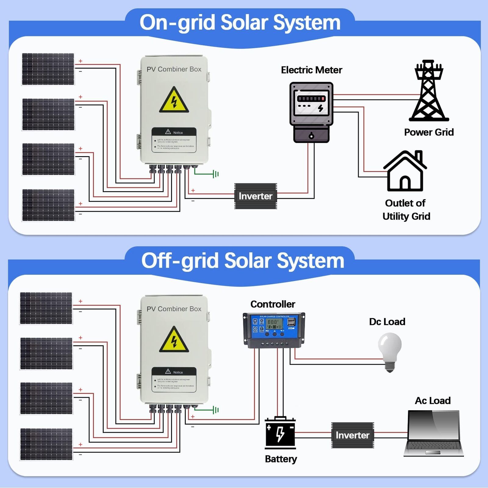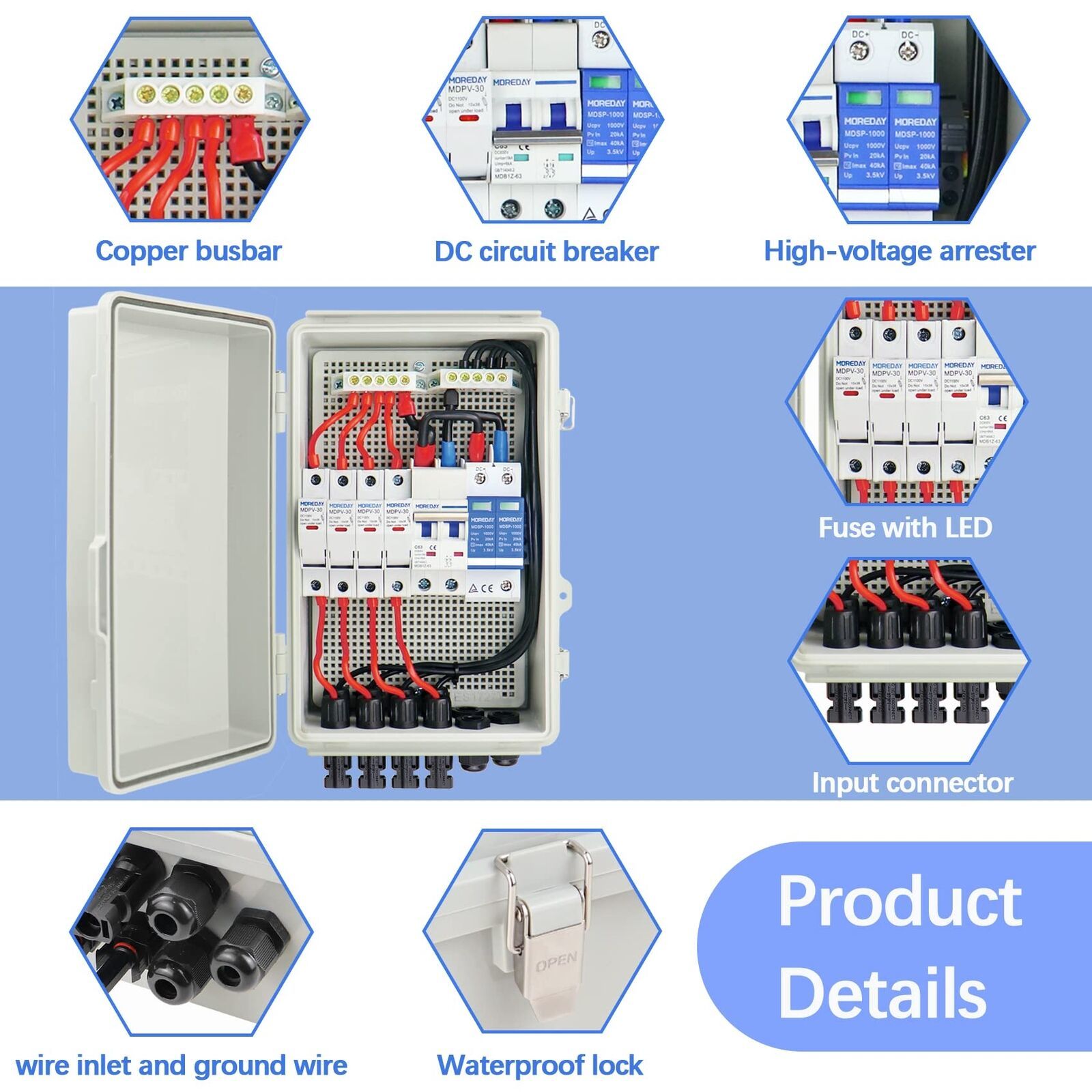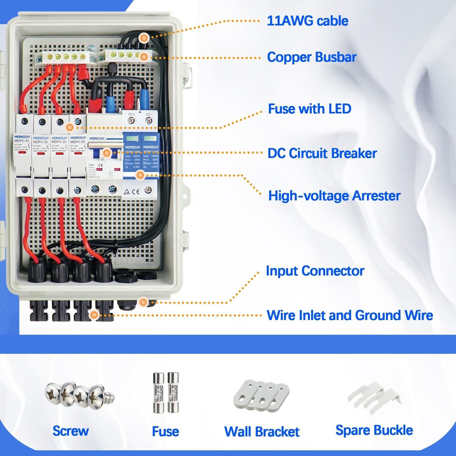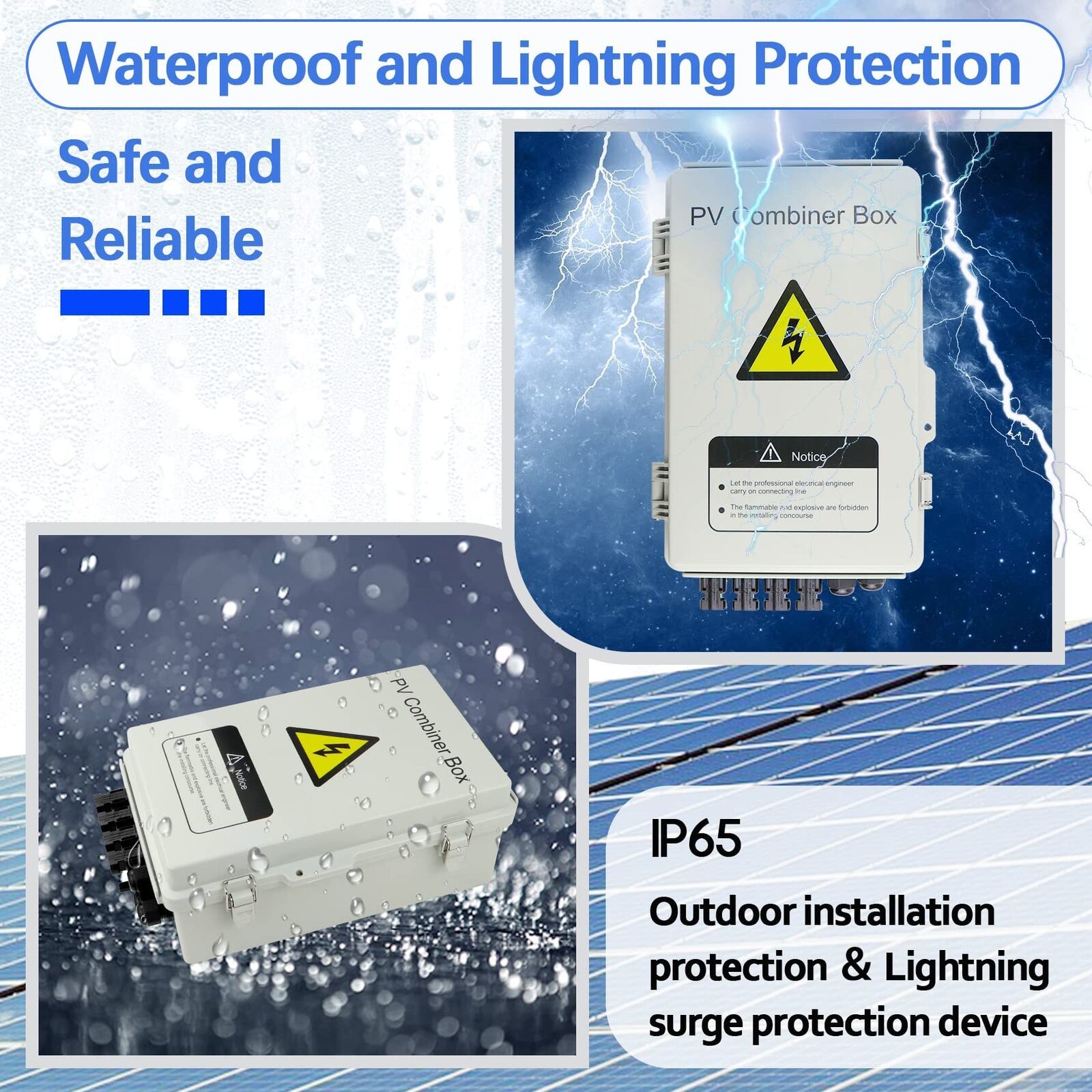 1) PROFESSIONAL MANUFACTURING: Solar combiner box organize the connection and convergence of PV modules. It is used to reduce the connection between the photovoltaic array and the inverter, optimize the system structure, facilitate the quick disconnection of the circuit during maintenance, and reduce the scope of power outages when the photovoltaic system fails. It will keep the PV system at its best and increase the output power 2) SAFE AND RELIABLE: The PV combiner box is equipped with 4*15A DC fuse, high voltage arrester, 63A DC circuit breaker, copper busbars, 11AWG PV cables, IP65 waterproof ABS shell, providing protection against short circuit fault, lightning surge, over Voltage and overcurrent protection. Avoid damage to PV panels and inverters in the event of a failure. We have additionally configured two copper busbars in the PV combiner box to prevent current backflow and improve the safety of use 3) EASY INSTALLATION: Plug and play, pre-connected cables make connecting your solar panel system easier and faster, saving you a lot of time. IP65 waterproof PV combiner boxes for solar are certified for outdoor installation, insulated, moisture-proof, waterproof, dust-proof, UV-proof, and can be installed on any regular surface 4) WIDE RANGE OF APPLICATIONS: Suitable for photovoltaic grid-connected and off-grid power generation systems, solar panel systems, photovoltaic arrays, RV solar energy, and household solar panel systems. It can support solar panel systems up to 720W in 12V systems, 1440W in 24V systems, and 2880W in 48V systems. Compatible with any brand of solar panels and solar connectors 5) WHAT YOU WILL GET: 1*4 Strings of PV combiner box, 2* extra fuses, 2* wire fixing brackets, 4* mounting buckles, 4* screws, 1* instruction manual.Our is committed to providing superior product durability and quality. A 90-day worryfree refund and a 3-year product warranties for the product. If you encounter a problem in use, please do not hesitate to contact us, we are very glad to give you a satisfactory solution within 24 hours