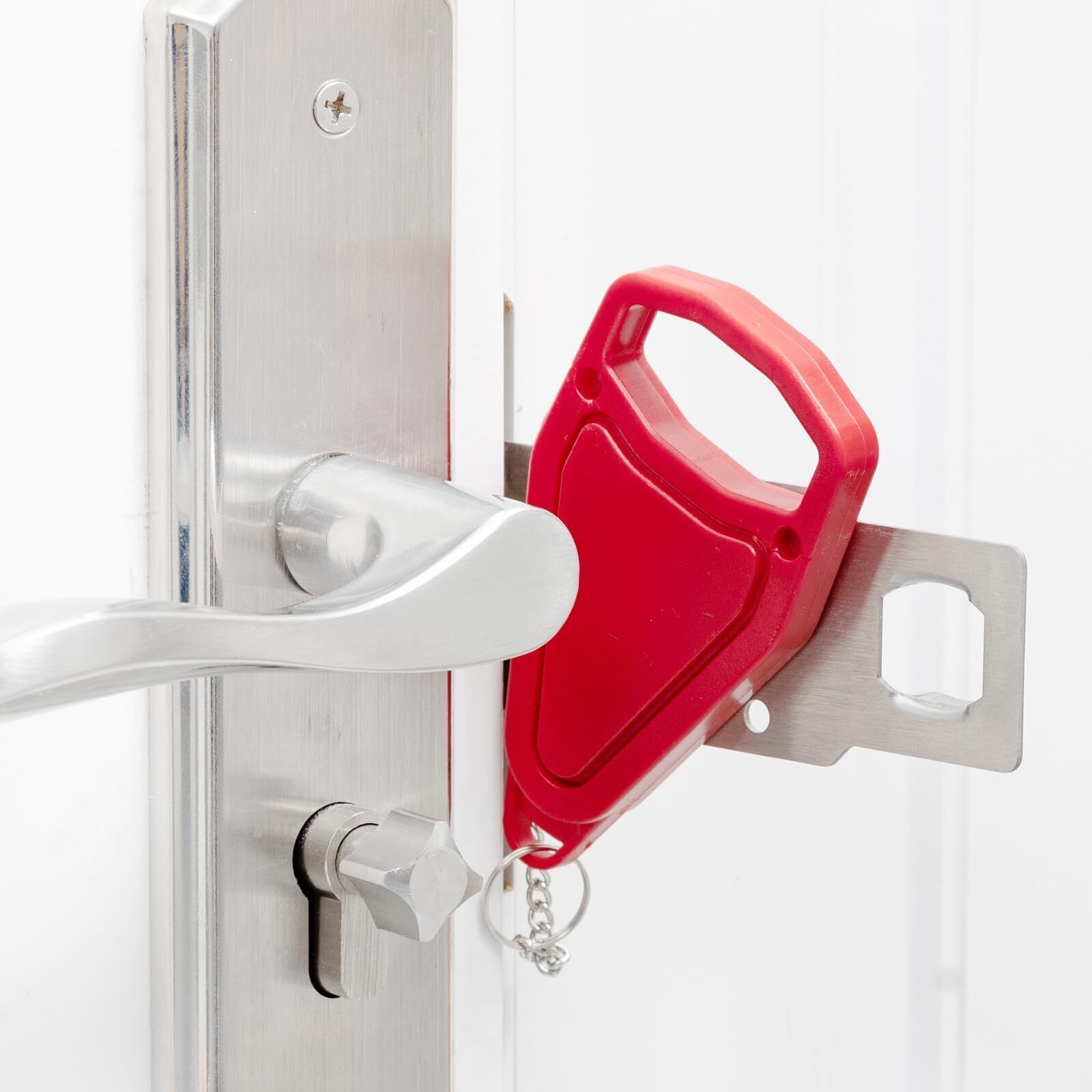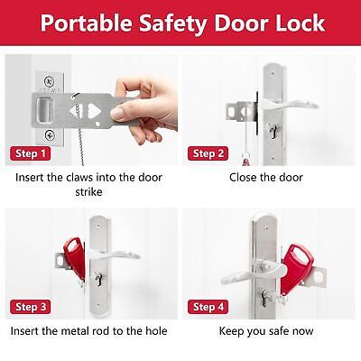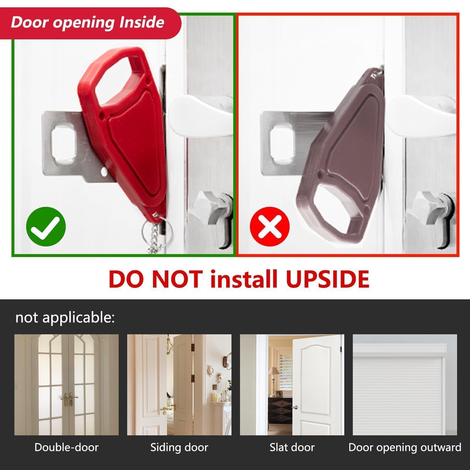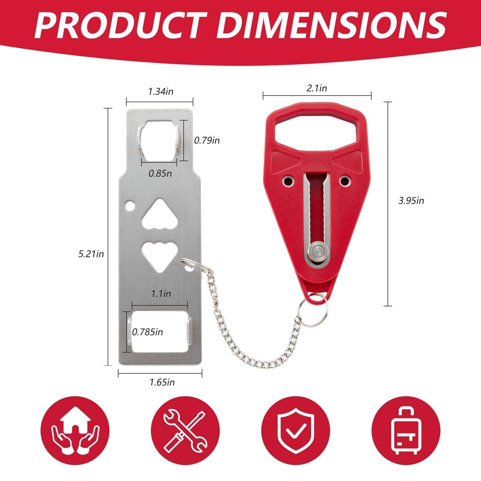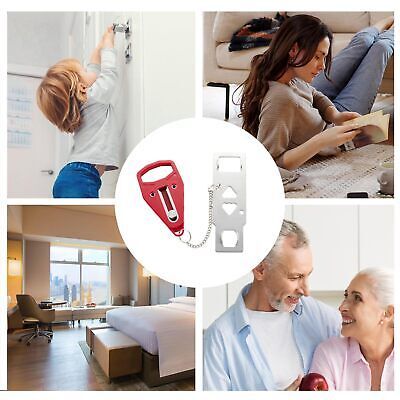 Color: RedFeatures: ?HIGH QUALITY MATERIALS ?The door safety device is made of thickened stainless steel material and rugged ABS plastic cover , which effectively protects the door from damage under pressure,sturdy and durable. The surface Used the latest electroplating and polishing technology ensure a perfect smooth touch and avoid any injury when using the door lock. ?SECURITY AND PRIVACY?This portable door lock provides you with extra security and privacy, the door can't be opened from the outside even with a key, greatly improves your security, prevents unauthorized persons from entering, and is a great helper for you to business trips, travel or live alone. ?EASY TO INSTALL OR REMOVE ? The HOME MASTER HARDWARE portable locks can be installed in seconds, without any tools, even in emergencies and darkness. Just insert the piece of metal into the slot of the door lock, close the door, and press the button into the lock in place, then no one can open the door from the outside. ?WIDE APPLICATION?The security door stopper contains two holes of different sizes to ensure that all types of locks match. It can be applied to avoid pets going out, and also to prevent children from opening their doors to strangers,adding extra security to your room, suitable for hotels, apartments, short rentals, Airbnb, dormitories, bathrooms, bedrooms or private rooms to use it as a front door lock, hotel door lock, dorm or bedroom door lock, or child safety lock. ?TRAVEL PORTABLE DOOR LOCKS?A travel essential for women and men, Portable hotel door security device is compact and portable, small enough to carry in pocket or handbag, very suitable safety door lock for travel. Details: Portable hotel door jammer is compact and portable, small enough to carry in pocket or handbag, very suitable safety door lock for travel. It's small but will perfectly hold your door shut firmly. gives you a lot of peace of mind when you are home alone or traveling. Prevent the sudden Come of strangers. Door security lock for self-defense, add a sense of security, peace of mind sleeping. A must-have for security on vacation. Portable lock installs in seconds without any tools required. No need to nail or screw into anything, just put the metal part of the door security device goes into the hole on the door jam then close the door, and press the button into the lock in place.Package Dimensions: 5.7 x 3.3 x 1.1 inches