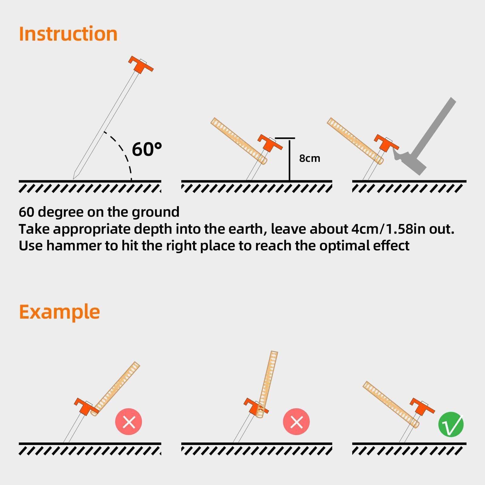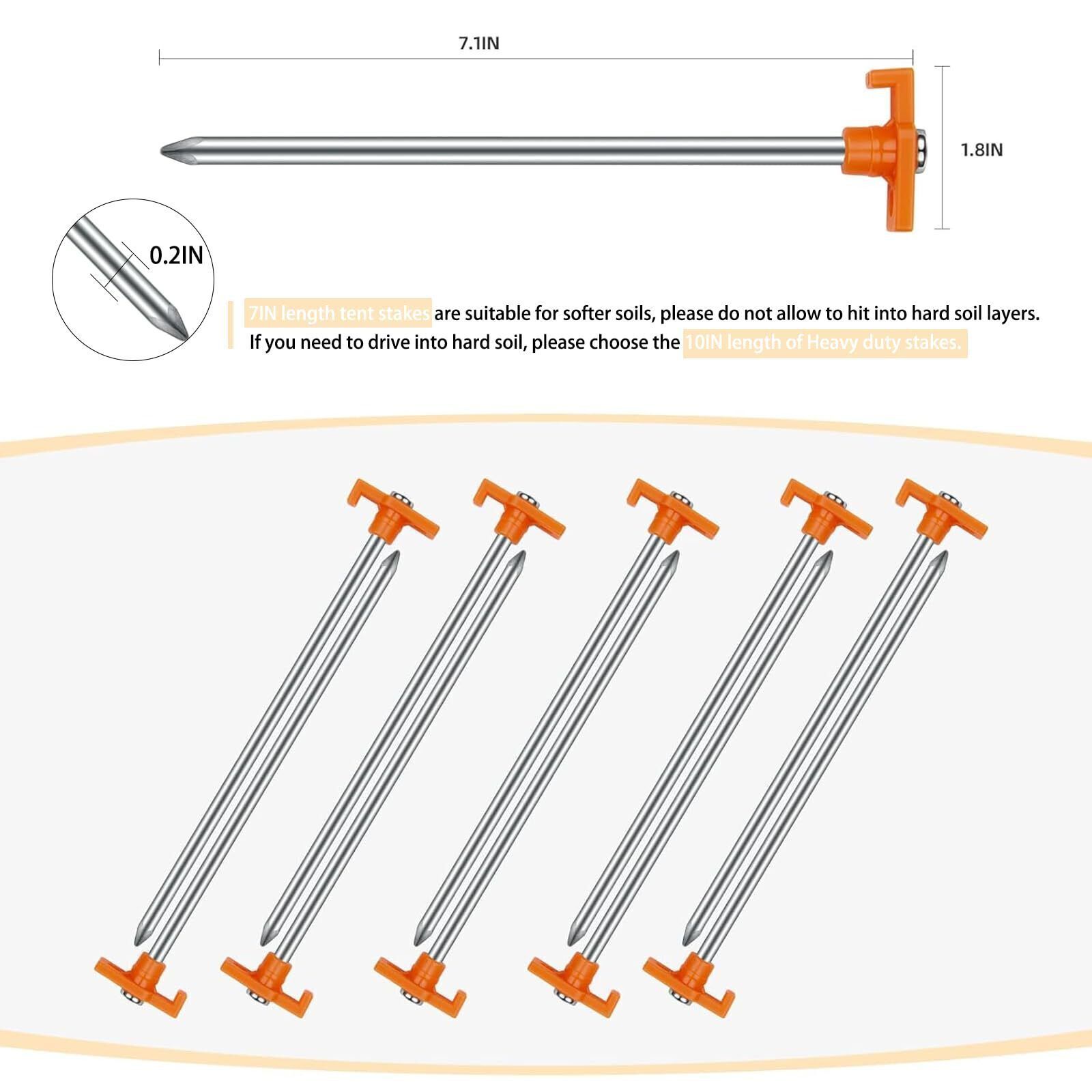 Color: Orange 12pcsFeatures: CAMPING STAKES MATERIAL: Galvanized steel for corrosion resistance;Milled points prod easily into hard soil with PP head for mallet driving DESIGN ADVANTAGES: The unique plastic flat head shape will not protrude and cause people to trip over;The bright colors can be seen clearly from a distance and will not be difficult to find when pulling out JUST THE RIGHT WEIGHT: The weight of iron stakes with the same purpose and length on the market is about 0.3LBS/1PCS, while our nails are only 0.07LBS/PCS, which undoubtedly reduces a lot of burden on your travels SUITABLE FOR MULTIPLE SCENARIOS: In addition to being used to secure tents, canopies, tarps, rope racks, fences, awnings, and beach umbrellas, the nails can also be used to secure your child?s trampoline, support fixed plants, and secure Christmas giant balloon TO COPE WITH MORE NEEDS: If you do not want to carry a lot of heavy anchors, we also have a small number of options, this 7in nail only 0.07LBS/PCS Package Dimensions: 9.7 x 4.7 x 1.7 inches