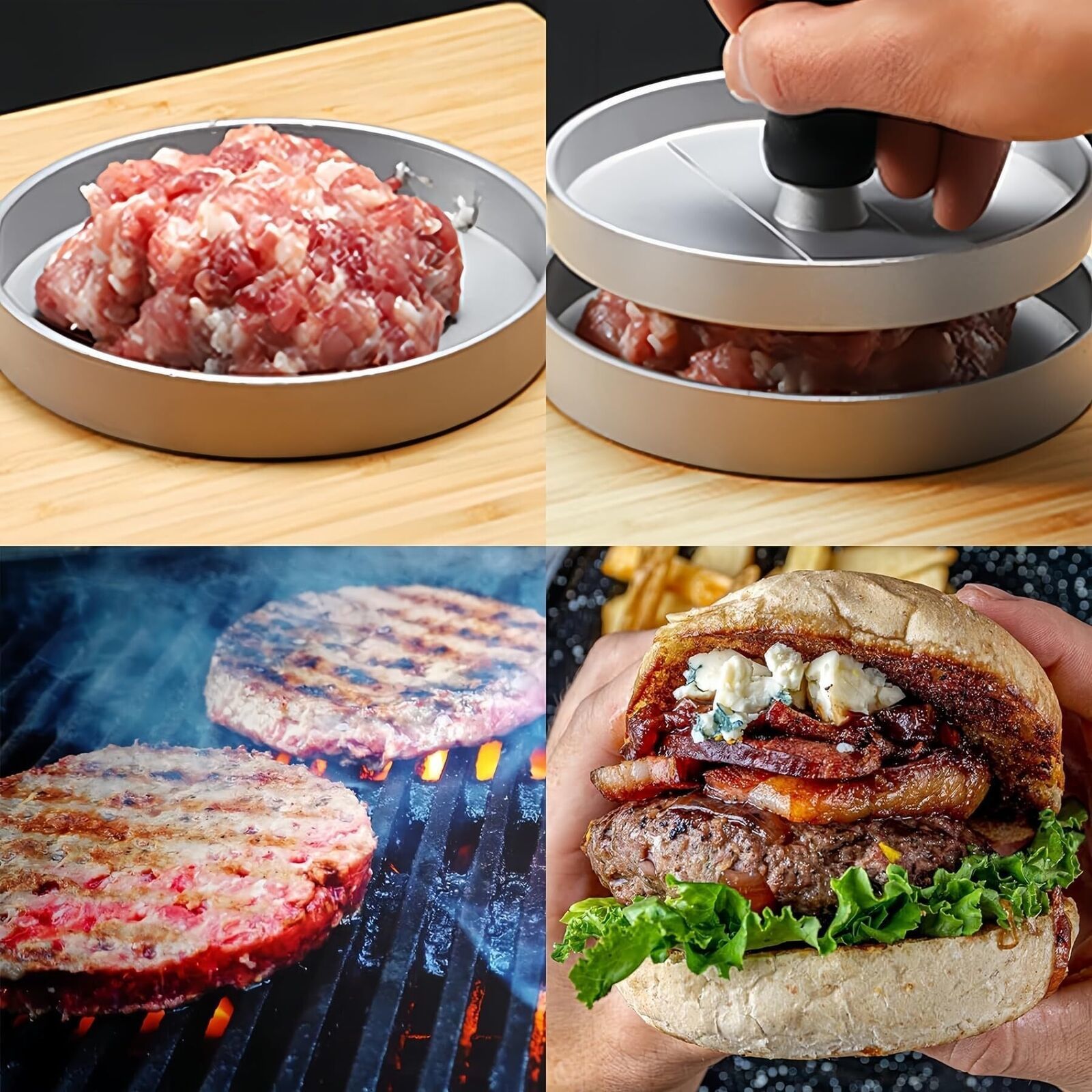 Color: GrayFeatures: Effortless Grilling: This burger press set makes forming perfect patties a breeze. Simply add ingredients, press, and grill for evenly cooked results every time. 100 Patty Papers Included: Get started right away with 100 disposable non-stick round patty papers that release cleanly without tearing or sticking to cooked burgers. Versatile Patties: Form traditional beef burgers or experiment with chicken, fish, veggie or cheese blends. The extra large 4.7 inch diameter mold accommodates any filling. Heavy Duty Construction: Solid cast aluminum construction delivers years of use. The press plates are non-stick coated for mess free pressing and cleaning is as easy as washing by hand or putting in the dishwasher. Package Dimensions: 5.0 x 4.8 x 1.5 inches