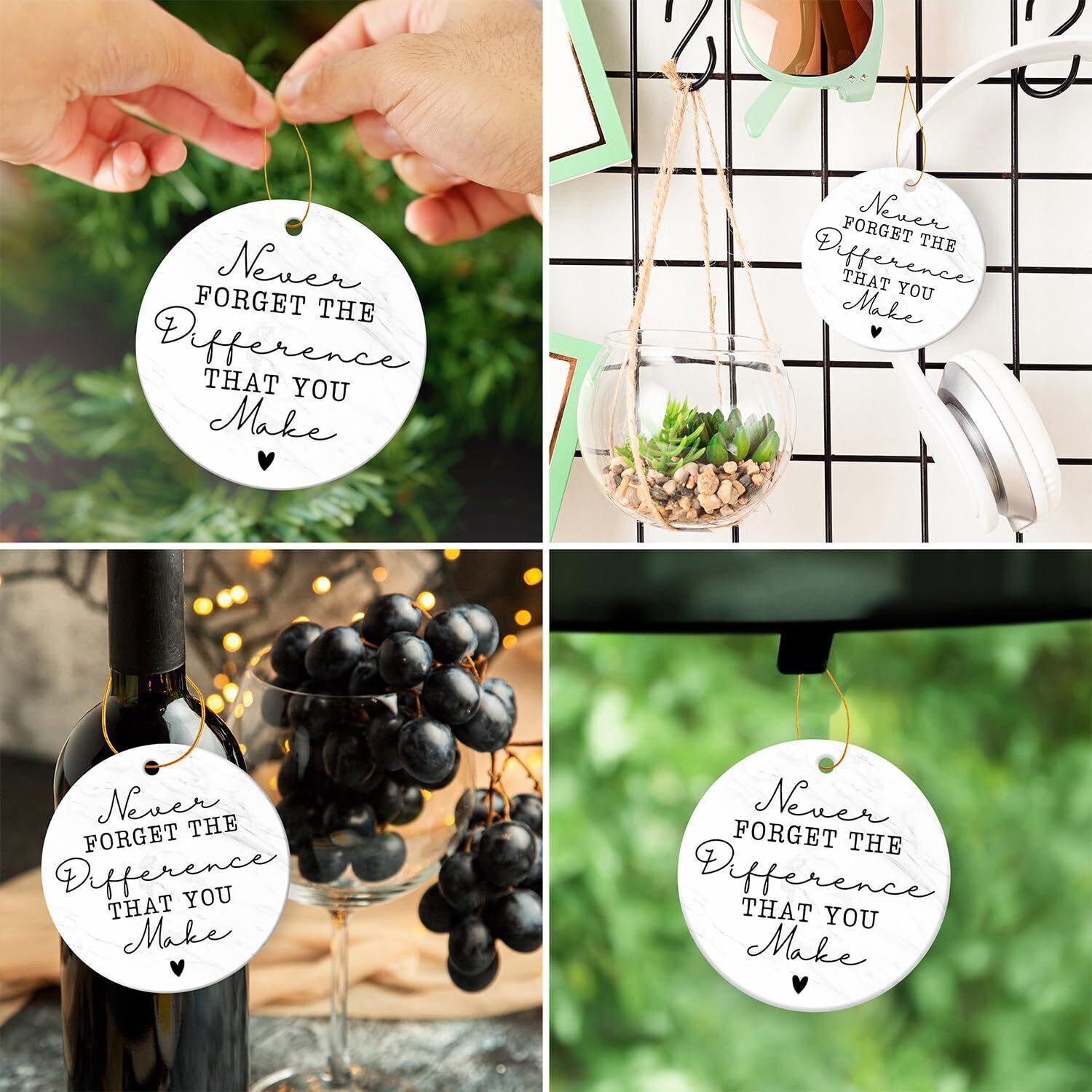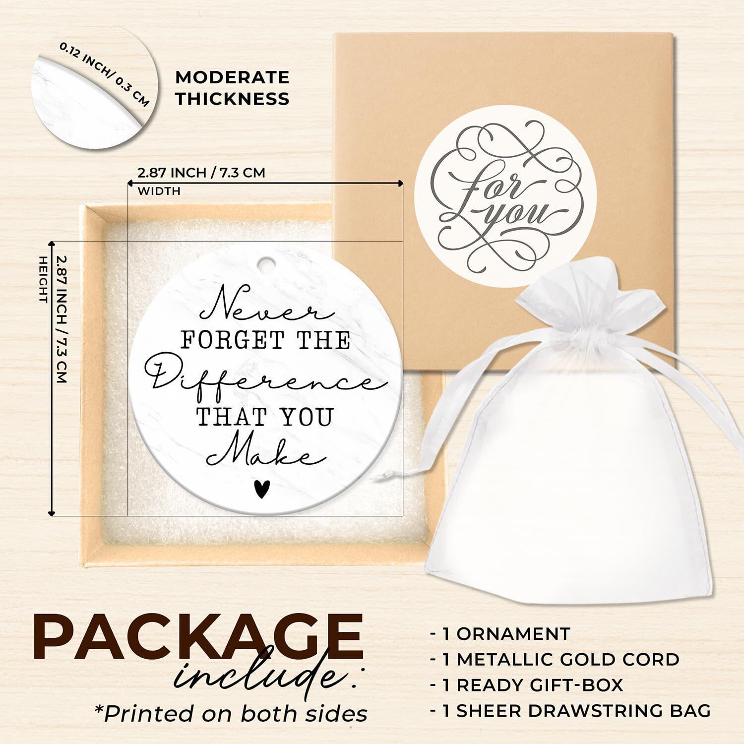 Color: Thank You 1Features: Appreciation gifts for women/men: Seeking a heartfelt gesture? Our ceramic ornament, adorned with the uplifting quote 'Never Forget The Difference That You Make,' is perfect for expressing gratitude and appreciation. Suitable for men or women, it serves as a lasting reminder of the impact they've had. Let your loved ones know that their efforts are cherished and will never be forgotten. Ideal gift for thank you, retirement, farewell, goodbye, going away, leaving, Administrative Professional Day Keepsake gifts: The ornament's design beautifully encapsulates an inspiring message, providing a daily source of motivation for your coworker, boss, friend, teacher, daycare, nurse, manager, social worker or anyone deserving of appreciation. It effortlessly infuses their workspace with inspiration. This versatile gift is fitting for birthdays, anniversaries, graduations, leaving, new job, Teacher Appreciation Week, Nurses Day, Christmas, or any occasion where expressing gratitude is paramount Ideal size for versatile decor: Our ornament hanger boasts a convenient 2.87 inch/ 7.3 cm diameter and a slim 0.12 inch/ 0.3 cm thickness. This lightweight and attention-grabbing piece can seamlessly fit into any space. Whether you're looking to enhance your home decor or searching for a thoughtful gift, our exquisite craftsmanship elevates any setting Crafted from premium ceramic: Embrace the enduring charm of high-quality white ceramic, renowned for its durability. Both the front and back feature identical, vibrant patterns that won't blur or fade. Waterproof and wear-resistant, this ornament promises to maintain its pristine look for years to come Thoughtful package: Our Ornament comes complete with 1 Two-Sided Ornament, 1 Ribbon for easy hanging, and 1 Gift Box, all meticulously crafted. The two-sided design and attached ribbon make it a breeze to hang anywhere from any angle, be it in a classroom or your home. Rest assured, the high-quality brown cardboard box ensures the ornament remains well-protected during transit, avoiding any damage Package Dimensions: 3.8 x 3.8 x 1.3 inches