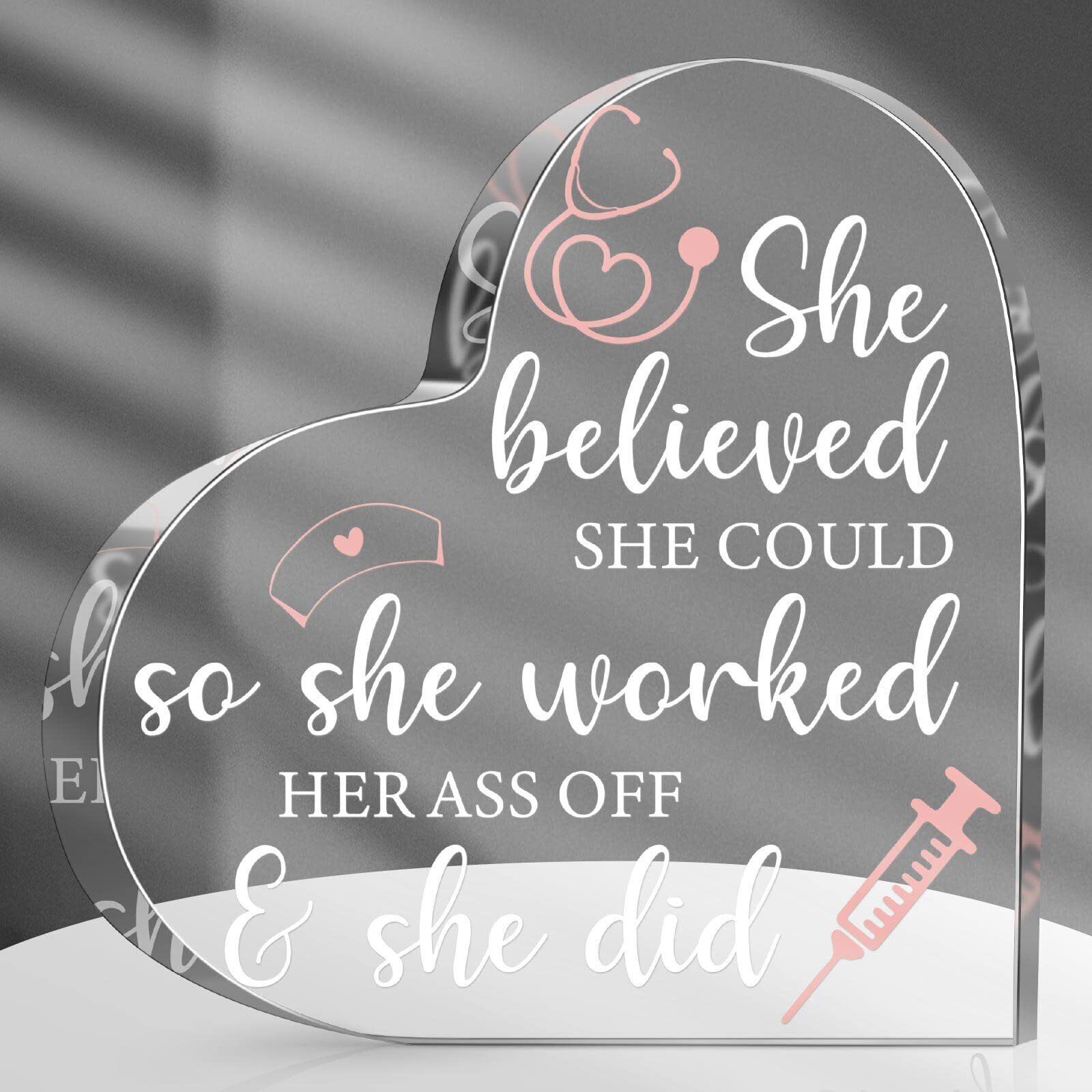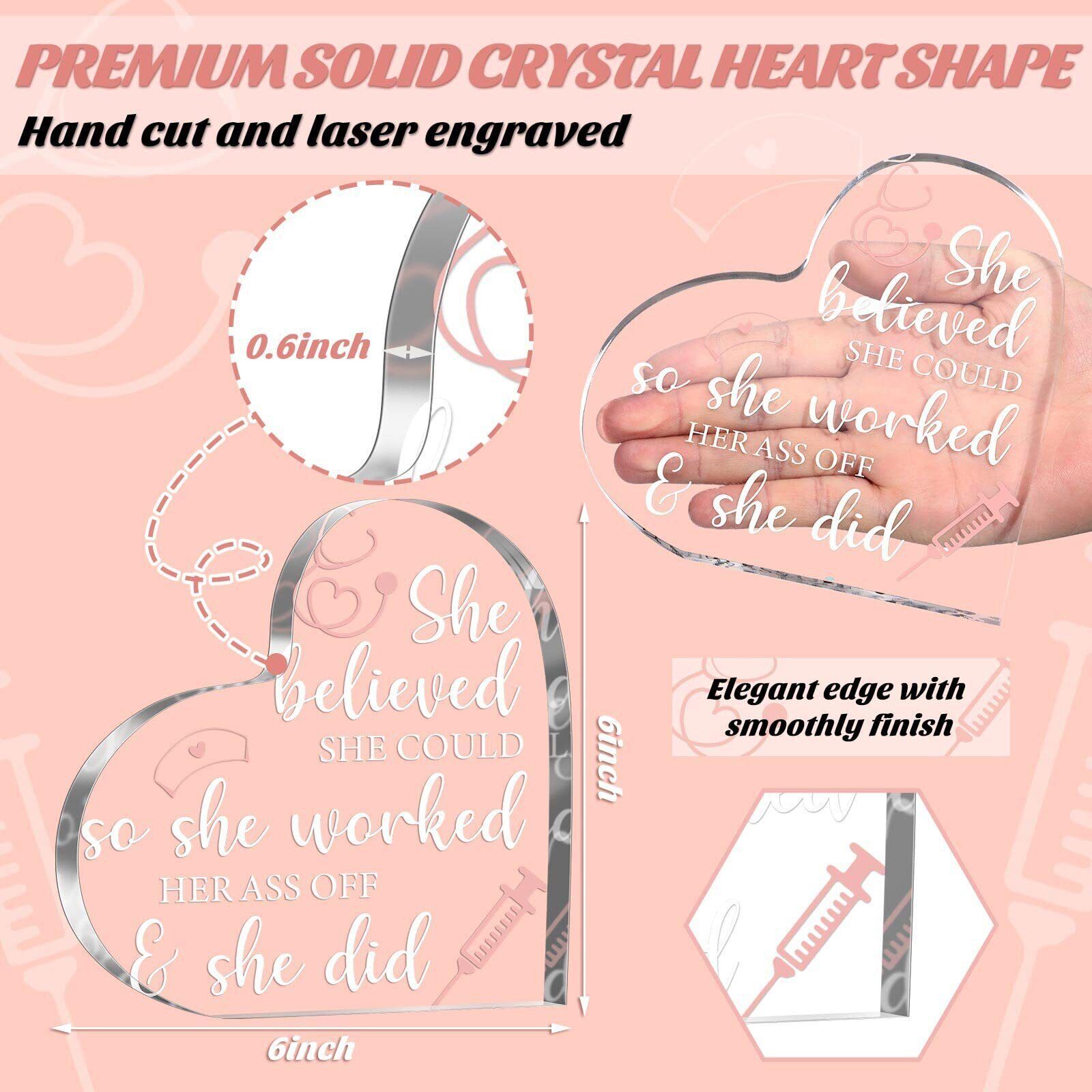 Color: pinkFeatures: Sturdy Material: this nurse gift for women is made of acrylic material, which is smooth in surface, sturdy and not easy to break, printed with clear and vivid paintings that are hard to fade, able to serve you for a long time Nursing Gift: this registered nurse graduation gift is ideal to be a funny and heartwarming gifts sent to different kinds of nurses, such as RN, LPN, NP and more, and you can prepare this gift when it is Nurses' Day, nurse's birthday, nurse's graduation day, nurse week and so on Encouraging Meaning: this nursing birthday gift is designed into a heart shape, printed with inspirational words, patterns of stethoscope, needle and nurse hat, which can bring the nurse energy and passion for life and work, expressing your sincere care and affection, giving them an unexpected surprise while strengthening your relationships Widely Applied: this nurse week gift is widely applied, you can take it as a decoration and place it on your table, desk, shelf in your office, study or living room, or consider it as a keepsake for some important days, also you can use it as paperweight to add weight to the paper Proper Size: this nurse practitioner gift for women measures approx. 15.12 x 15.12 x 1.4 cm/ 6 x 6 x 0.6 inches, which is proper to be placed on the table or desk without taking up too much space, easy to store and carry Package Dimensions: 6.3 x 6.3 x 0.7 inches