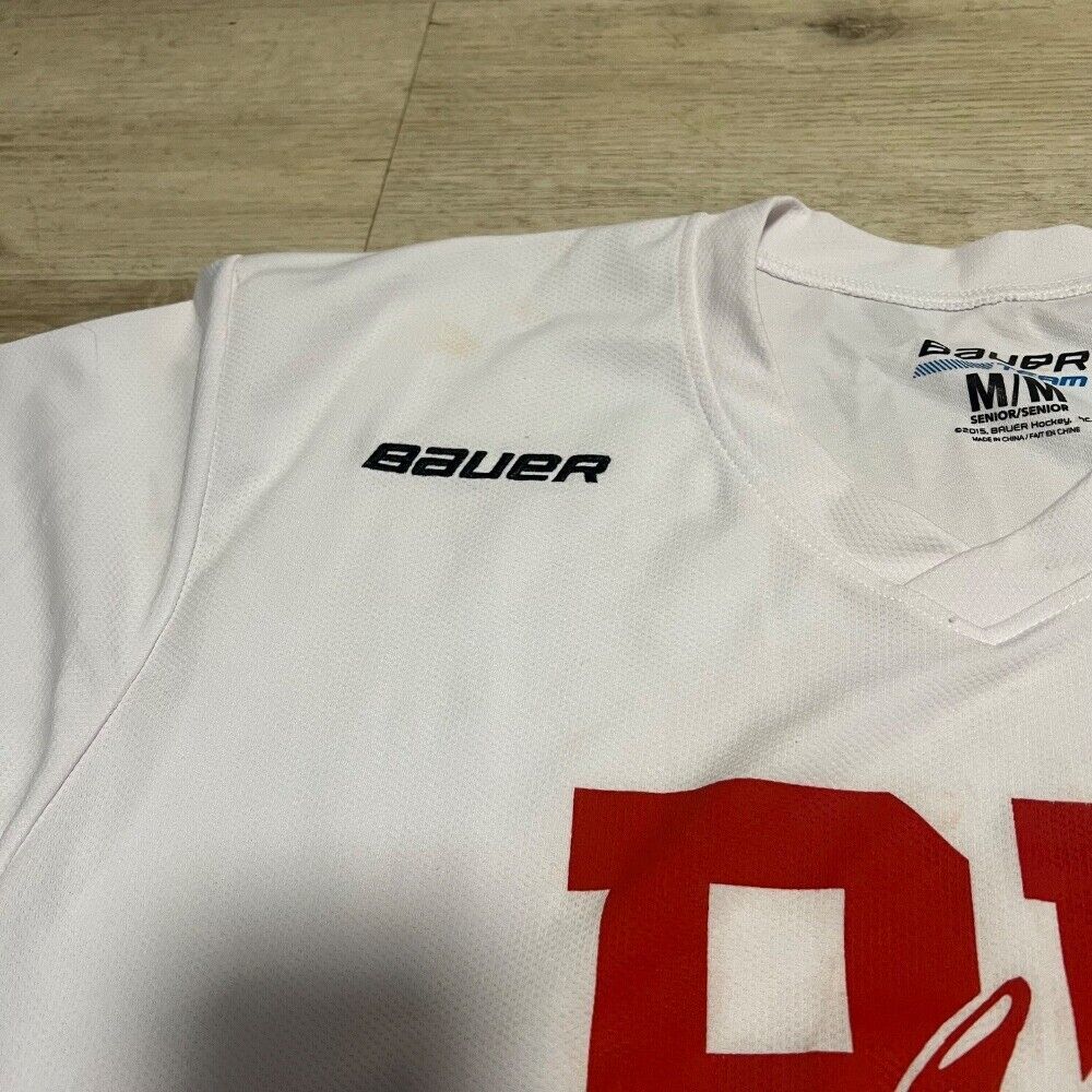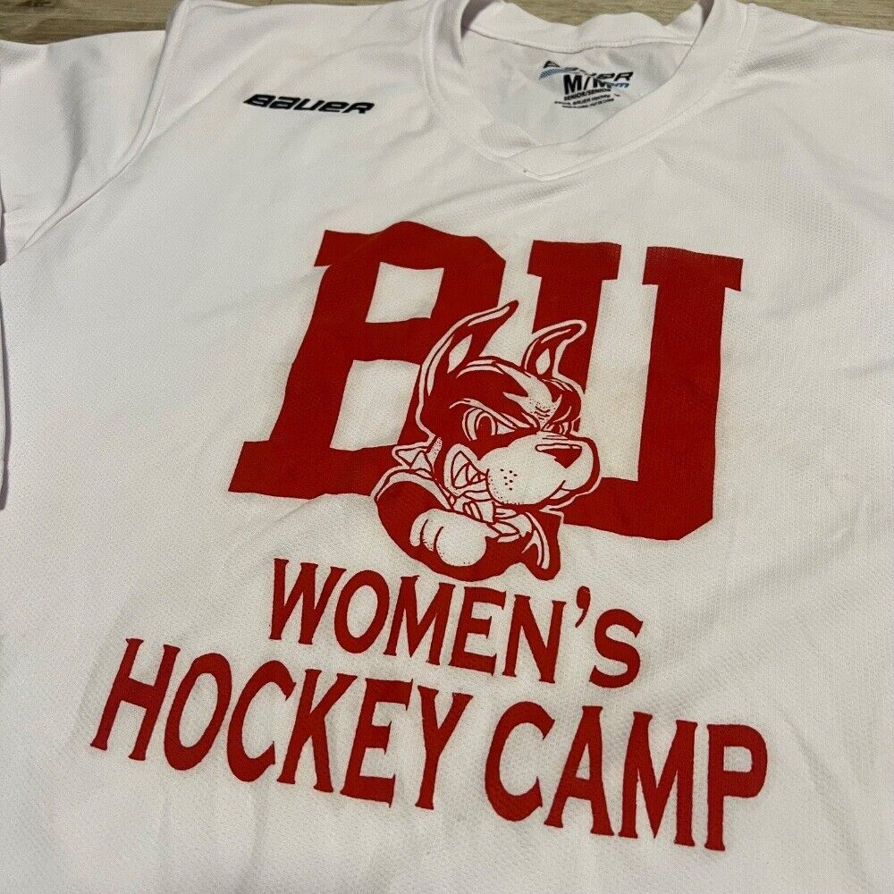 Keywords: Bauer, Hockey Jersey, BU, Boston University, Women's Hockey Camp, White Jersey, Medium, College Hockey, Fan Apparel, Sports Memorabilia, Hockey Collectible, Red and White, Dog Mascot