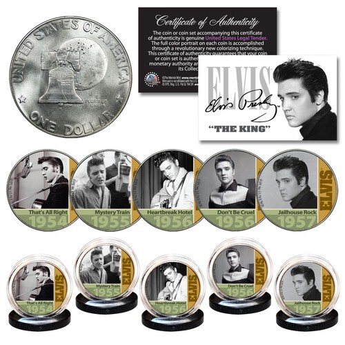 This ELVIS PRESLEY 1956 #1 SONG Hits complete 5-coin set is a treasured collectible, combining the popularity of Elvis Presley with coin collecting. Here is your chance to own beautifully colorized JFK Kennedy Half Dollar U.S. Coins. These high-quality genuine Legal Tender U.S. coins have been colorized using a unique painstaking multicolor authentic process. Colorizing coins involves the unique application of special inks directly to the surface of a coin that achieves a level of detail, color saturation, and durability that is #1 in the coin industry. The result is an everlasting colorized coin collectible of ultra-high quality. Each coin comes in a premium coin capsule. The set comes with a Certificate of Authenticity to guarantee that your coins are authentic and recognized by every monetary authority around the world, assuring its Collector Edition status.