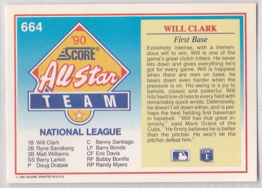 M) 1991 Score Baseball Trading Card - All Star Team - Will Clark #664