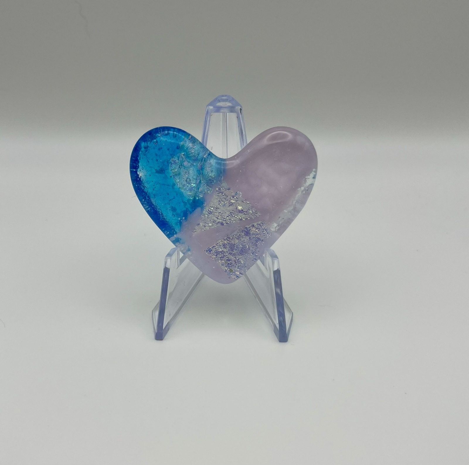 Treat yourself or a special person in your life, to an individually crafted piece of dichroic glass art. Every heart is numbered and signed by the artist, Lauren Mentzel. Each heart mirrors the depth of the cosmos.