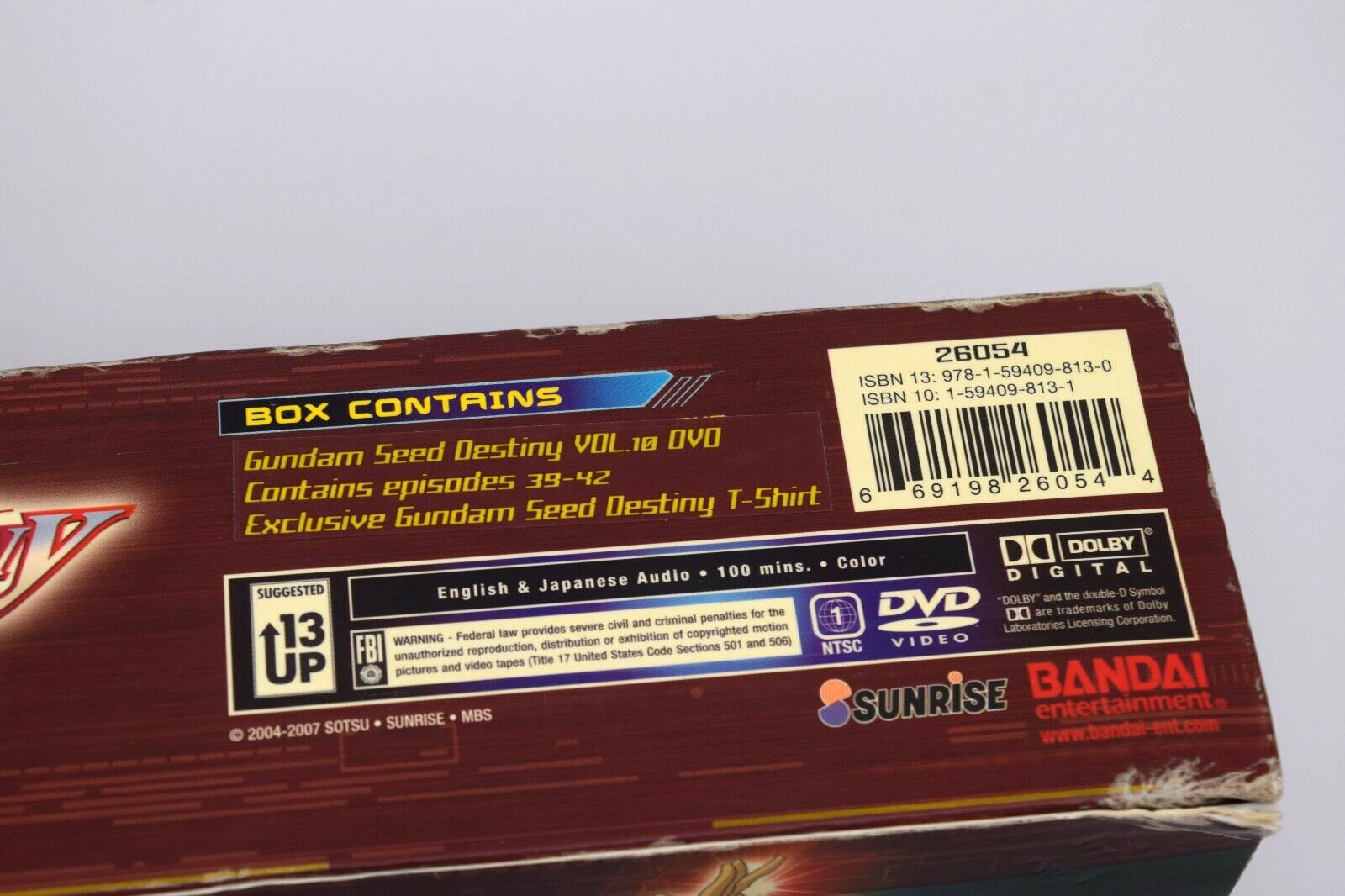 Gundam Seed Destiny Vol. 10 Special Edition (DVD, 2007) w/ T-Shirt Size L. Contains Episodes 39-42. DVD is sealed and new, T-shirt is new unworn. Box has a good amount of wear and some damage. See all photos for details and condition. Will ship USPS Media Mail.