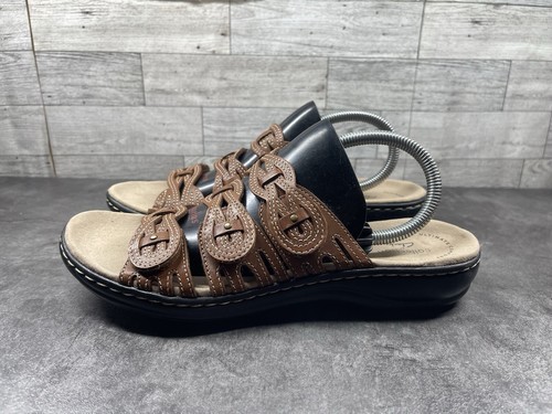 Clarks Slides Sandals Women 8.5 N Leisa Faye Shoes Brown Leather Comfort Straps