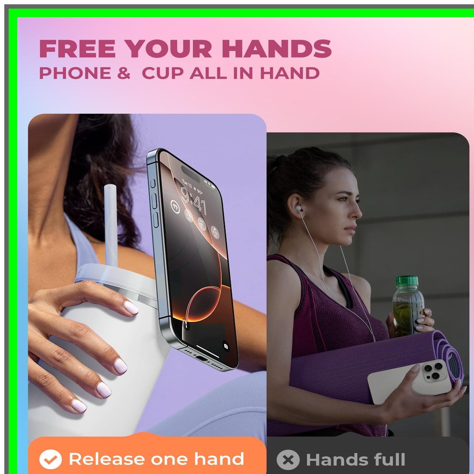 Conveniently holds phone and bottle, prevents spills.