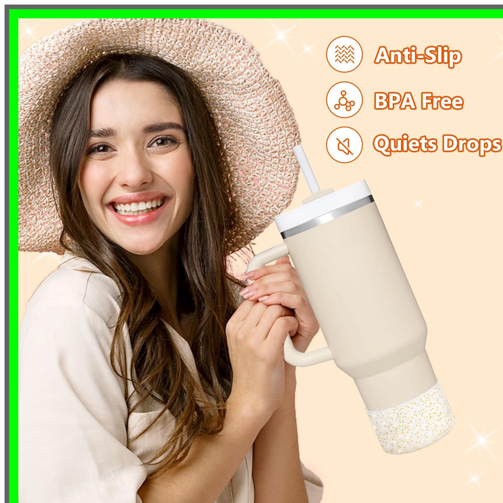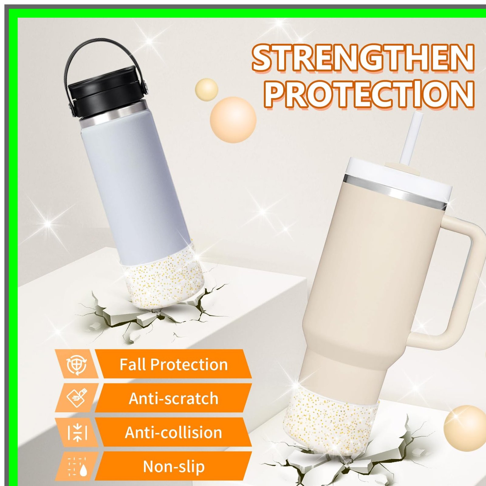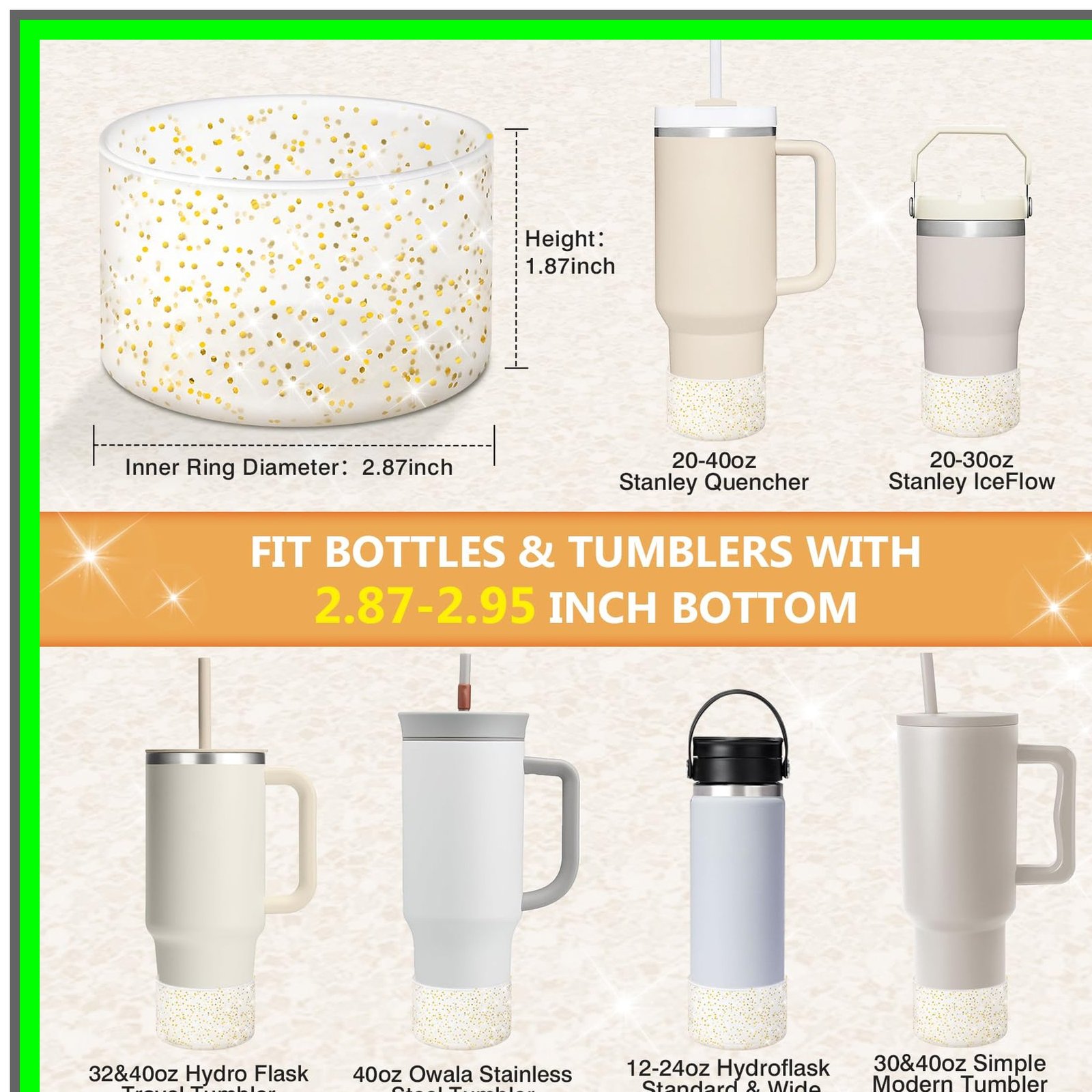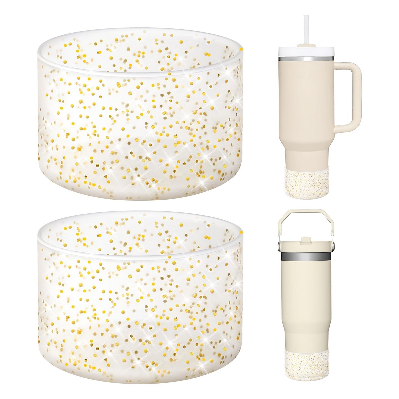 Introducing the Protective Bling Silicone Boot Sleeve, the ultimate accessory for your favorite tumblers and bottles! Designed to fit a wide range of popular drinkware, including the Stanley Tumbler (20-40oz) and Hydro Flask Bottle (12oz-24oz), this stylish silicone sleeve is perfect for anyone looking to protect their investment while adding a touch of sparkle to their daily hydration routine.Key Features:1. **Universal Compatibility**: The Protective Bling Silicone Boot Sleeve is designed to fit the bottom of bottles and tumblers measuring between 2.83 to 2.95 inches in diameter. This means it can accommodate a variety of popular brands, ensuring you can enjoy its benefits no matter your favorite drinkware.2. **Durable Protection**: Made from high-quality silicone, this boot sleeve provides a robust barrier against dents, scratches, and other damage. Whether you're at the gym, on a hike, or simply enjoying a day out, the Protective Bling Silicone Boot Sleeve keeps your tumbler looking brand new.3. **Stylish Glitter Design**: Who says protection can't be fashionable? The glitter finish of the Protective Bling Silicone Boot Sleeve adds a fun and eye-catching element to your drinkware. Stand out from the crowd while keeping your tumbler safe!4. **Easy to Clean**: The silicone material is not only durable but also easy to maintain. Simply wipe it down with a damp cloth or toss it in the dishwasher for a hassle-free clean, ensuring your sleeve stays looking fresh and vibrant.5. **Lightweight and Portable**: Weighing next to nothing, the Protective Bling Silicone Boot Sleeve is easy to carry wherever you go. Slip it on your tumbler or bottle, and you're ready for any adventure without the added bulk.6. **Eco-Friendly Choice**: By using the Protective Bling Silicone Boot Sleeve, you're making a sustainable choice. Silicone is a long-lasting material that reduces the need for disposable drinkware, helping to minimize your environmental footprint.7. **Perfect Gift Idea**: Looking for a unique gift for a friend or loved one? The Protective Bling Silicone Boot Sleeve makes an excellent present for birthdays, holidays, or any special occasion, combining practicality with a touch of glamour.Elevate your drinkware experience with the Protective Bling Silicone Boot Sleeve. Protect your tumblers and bottles while showcasing your personal style. Order yours today and enjoy the perfect blend of functionality and flair!