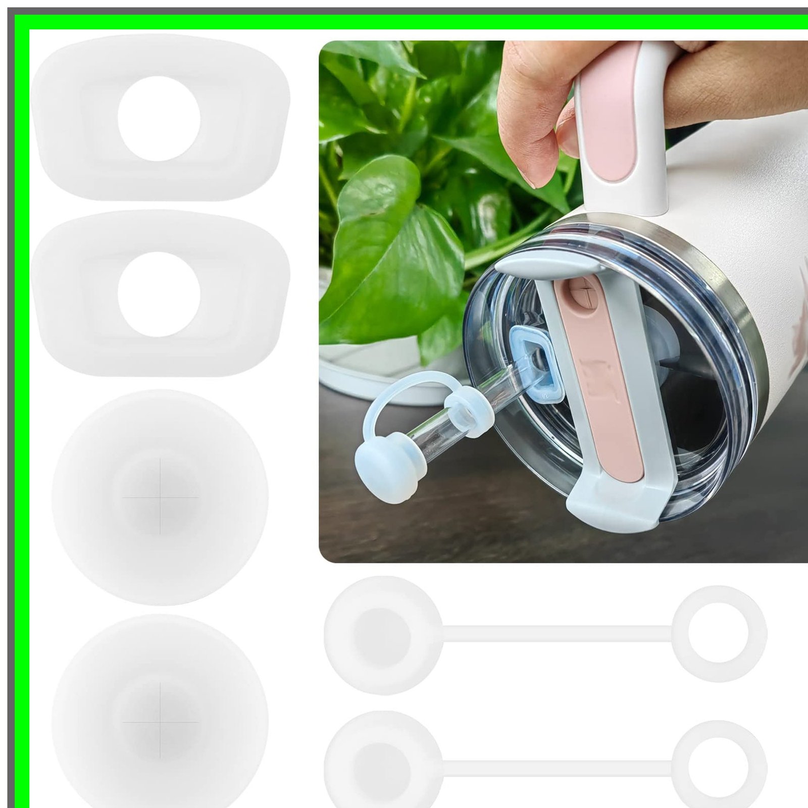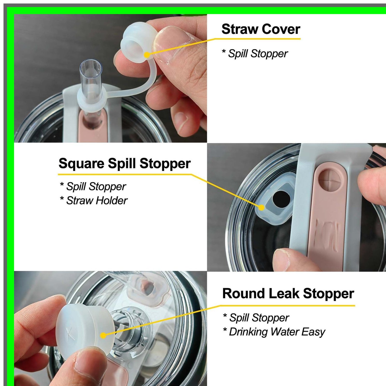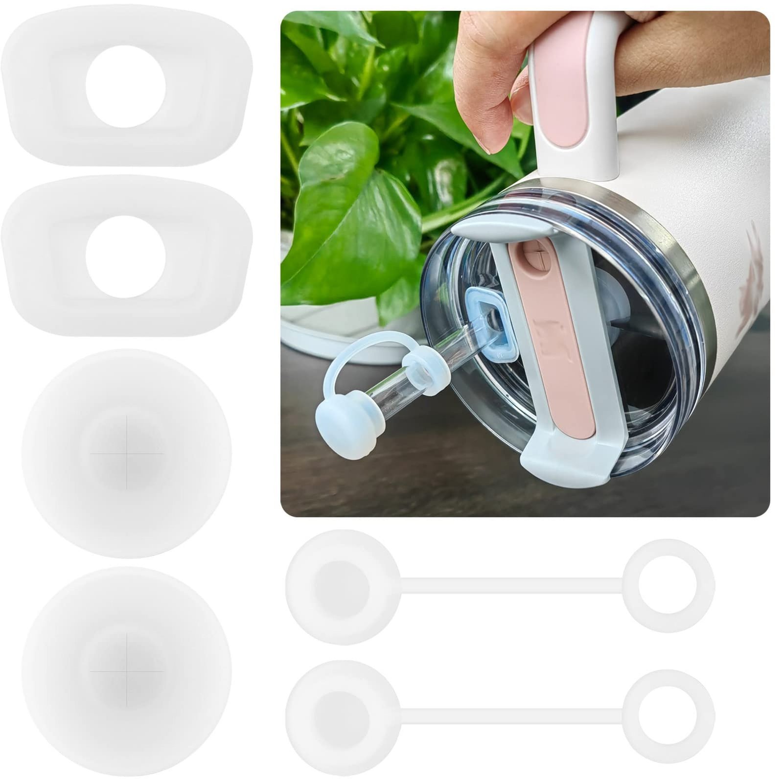 Introducing the ultimate solution to your beverage woes: the Spill Seal Stopper. Designed for those who are always on the go, this innovative accessory ensures that your drinks stay securely in your tumbler, allowing you to enjoy your favorite beverages without the fear of spills. Whether you're commuting, traveling, or simply enjoying a day out, the Spill Seal Stopper is your perfect companion.Key Features:1. **Effective Spill Prevention**: The Spill Seal Stopper is engineered to create a tight seal, preventing any accidental spills or leaks. Enjoy your drinks with confidence, knowing that your tumbler is protected.2. **Versatile Compatibility**: This spill stopper set is specifically designed to fit Stanley Cup 2.0 models, including the popular 40 oz and 30 oz sizes. It's the perfect accessory for your favorite tumbler.3. **High-Quality Materials**: Made from food-grade silicone, the Spill Seal Stopper is safe for all types of beverages. Its durable construction ensures long-lasting use, making it a reliable addition to your drinkware.4. **Complete Set**: Each Spill Seal Stopper package includes 2 straw covers, 2 square straw fix stoppers, and 2 round lid leak plugs. This comprehensive set provides everything you need to customize your tumbler for maximum spill protection.5. **Easy to Use**: The Spill Seal Stopper is designed for simplicity. Just attach the appropriate stopper to your tumbler, and you're ready to go. It's perfect for busy lifestyles where convenience is key.6. **Travel-Friendly Design**: Lightweight and compact, the Spill Seal Stopper is easy to carry, making it an essential accessory for travel. Enjoy your drinks anywhere without the worry of mess.7. **Elevate Your Tumbler Experience**: With the Spill Seal Stopper, you can enhance your drinking experience. No more worrying about spills ruining your day; just sip and savor your favorite beverages.8. **Clear and Stylish**: The clear silicone design of the Spill Seal Stopper complements any tumbler, adding a touch of style while remaining functional.Don't let spills ruin your enjoyment of drinks on the go. Invest in the Spill Seal Stopper today and experience the freedom of drinking anytime, anywhere. Say goodbye to mess and hello to convenience with this essential accessory for your tumbler!