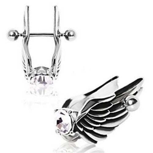 316L Surgical Steel Feathered Angel Wings with Gem Cartilage Earring Show off some heavenly style with this stunning Winged Cartilage Earring. Stun all those that pass with this polished metal design, crafted out of high quality 316L Surgical Steel, the Earring features an elaborate set of wings. Multiple layers of feathers are intricately detailed and lead to an eye-catching large 7mm Cubic Zirconium gem. Wear this Earring from a 16 GA Bar.