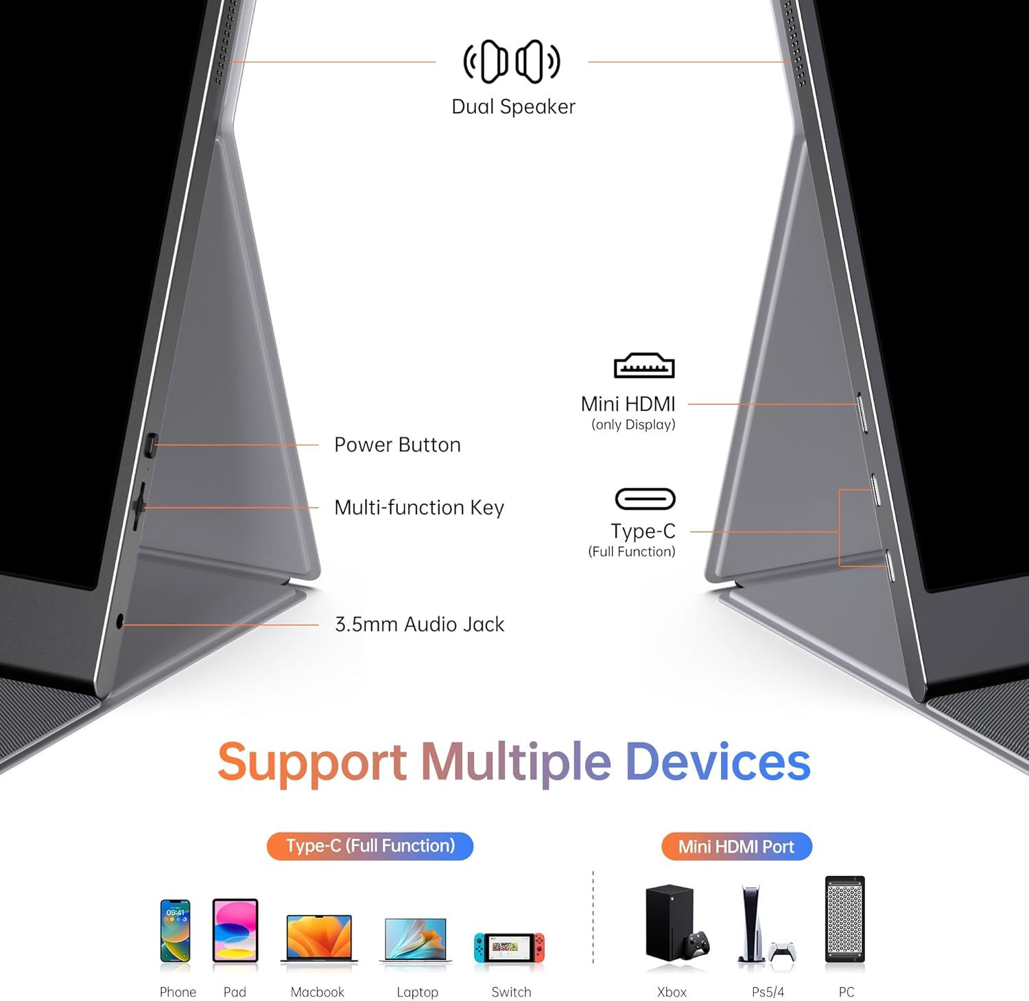 Extensive Compatibility - Forhelp portable monitor features 2 full-featured Type-C ports and 1 MINI HDMI port. You can easily access your favorite devices with just one USB Type-C or MINI HDMI cable. NOTE: Your device should support Thunderbolt 3.0/4.0 or USB 3.1 Type C DP ALT-MODE. It is compatible with all devices equipped with HDMI and USB Type-C ports like laptops, PS, XBOX, SWITCH game consoles. Full HD Portable Monitor - 15.6inch portable laptop monitor with 1920*1080 resolution, advanced IPS Matte screen support 178 full viewing angle, it renders accurate and bright color, draws you into the video or game with lifelike colors and amazing detail. It can effectively reduce blue light radiation damage, no flickering, eye-care, and make it easier to watch for a long time. Ultra-slim Portable Monitor - As a portable external monitor, Forhelp portable laptop monitor's body is made of aluminum alloy, the weight of the whole machine is 1.52lb, 0.3" ultra-thin profile, can easily fit into your bag, so you can carry it with you. With our magnetic smart holster, you can use and store it anytime. Able to Balance Work and Play - With multiple display modes [copy mode/extension mode/second screen mode]. During meetings,it can copy your laptop's content as a second screen to share with others. At work, it can be used as a second extended screen to increase productivity. In life, adjusting to HDR mode can upgrade the image to a new level, providing you with brighter highlights, more realistic colors and images. Two built-in speakers provide an amazing viewing and gaming experience. DURABLE SMART COVER - Comes with a scratch-proof smart cover made of durable PU leather exterior, doubles as a stand, provides comprehensive protection for this portable computer monitor. There are two grooves in the cover base to give at least some choice of viewing angle for your comfort. Please note: HDMI is on the left side of the product.