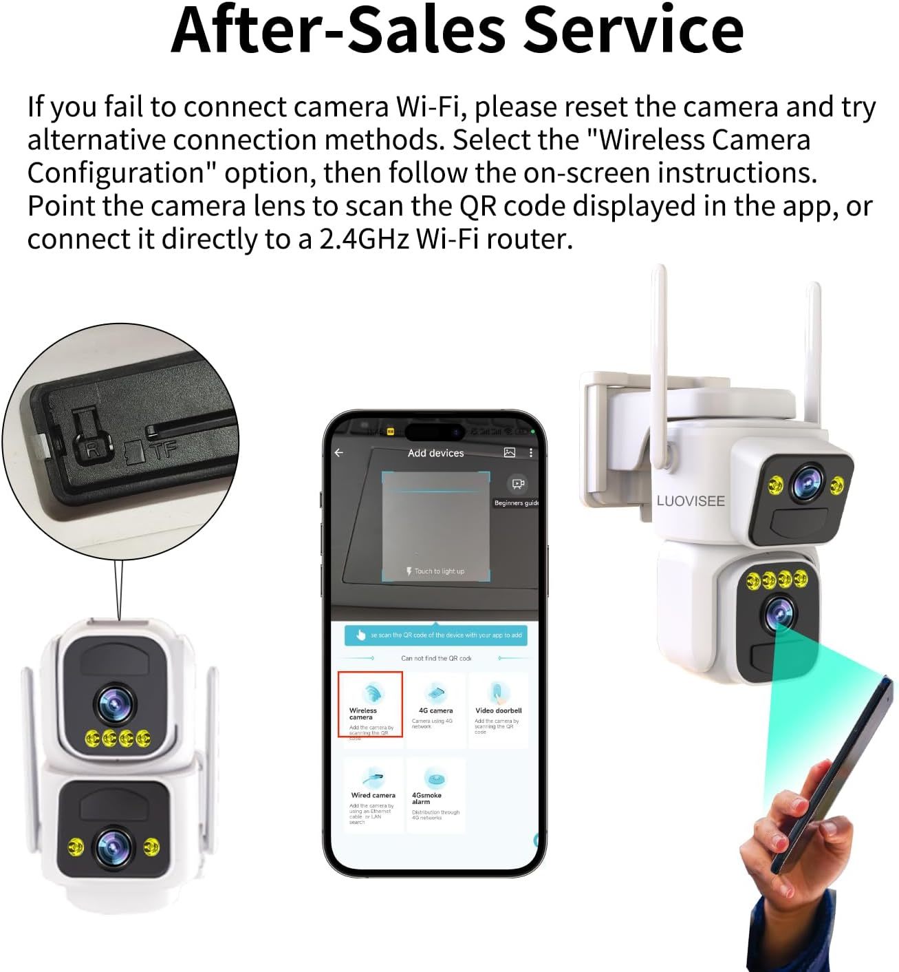 ?1 Device = 2 Cameras,2*2K Ultra HD Resolution Color Night Vision?Security Cameras Wireless Outdoor has two lens. 2 lens view cover 360,Each lens is 3MP/2K with sharper colors and details, allowing you to see everything that is happening within your surveillance area. One camera but function as 2. The camera is built-in 8 leds, the light could be set to motion triggle on or always on at night or close,and when the lights are on at night, extraordinary color night vision adds a glow to every dark night. ?Easy Use 100% Wireless Support 2.4GHz and 5G ?This outdoor camera comes with solar panel, rachargeale battery and built in wifi.Solar panel recharge battery, battery power camera when there is nu sunshine, wifi antena connect to your home 2.4Ghz/5G wifi routher.100% wireless free,no wire hassle. No need power plug-in. Mount the camera on the wall, then you could start 365 days surveillance. Very friendly for new user. (The user manual may incorrectly state that only 2.4G is supported; please disregard that information)This cameras for home security. ? Two-Way Audio Multi-user Sharing ?This cameras for home security built-in microphone and big volumn speaker, so that you can remote talk to the person who in camera,speaker volumn big enough.This home surveillance camera support multi users login. You could share camera access to your familers, so you all could liveview or playback camera at same time. ? Auto Alarm Motion Zone IP65 Weatherproof ?When the camera detects the movement,you could set it auto alarm, suitable for when you are at vacation in another city, help you scared away invade. Come with motion detection function, when there is motion, you could set to get alert information only when motion happen in you marked zone. It is for free. Othes camera charger for this function.This IP66 weatherproof camera withstands rain, snow and high temperatures.