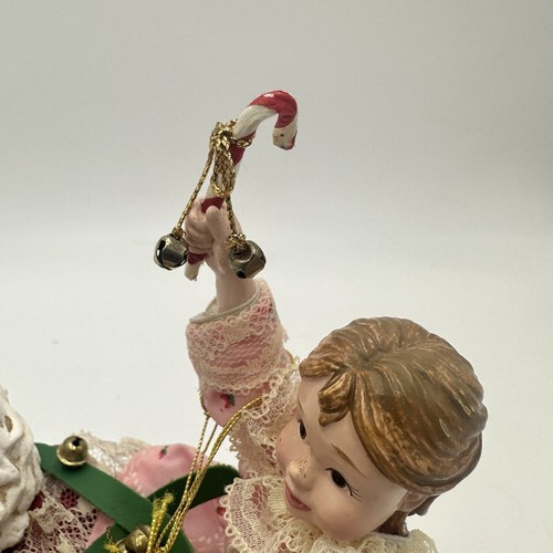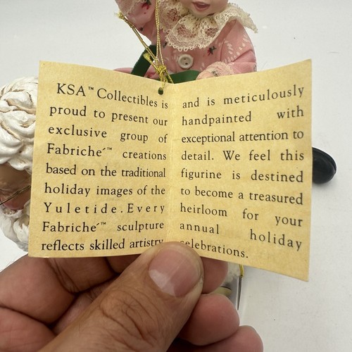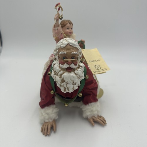 This Kurt S. Adler Fabriche Christmas figurine was designed by Marjorie Rothberg and is enitrely handmade. The piece is in very good condition with no losses or damage. Titled "Grandpa Santa's Piggy Back", it depicts a small girl piggy back riding on a bespectacled crawling Santa. The little girl holds onto a reign of sleigh bells and holds a belled candy cane in her uplifted hand. The figurine is a limited edition produced in 1993 and is fairly rare. It retains the original tags that indicate it was No. 3284 of an edition of 7500.