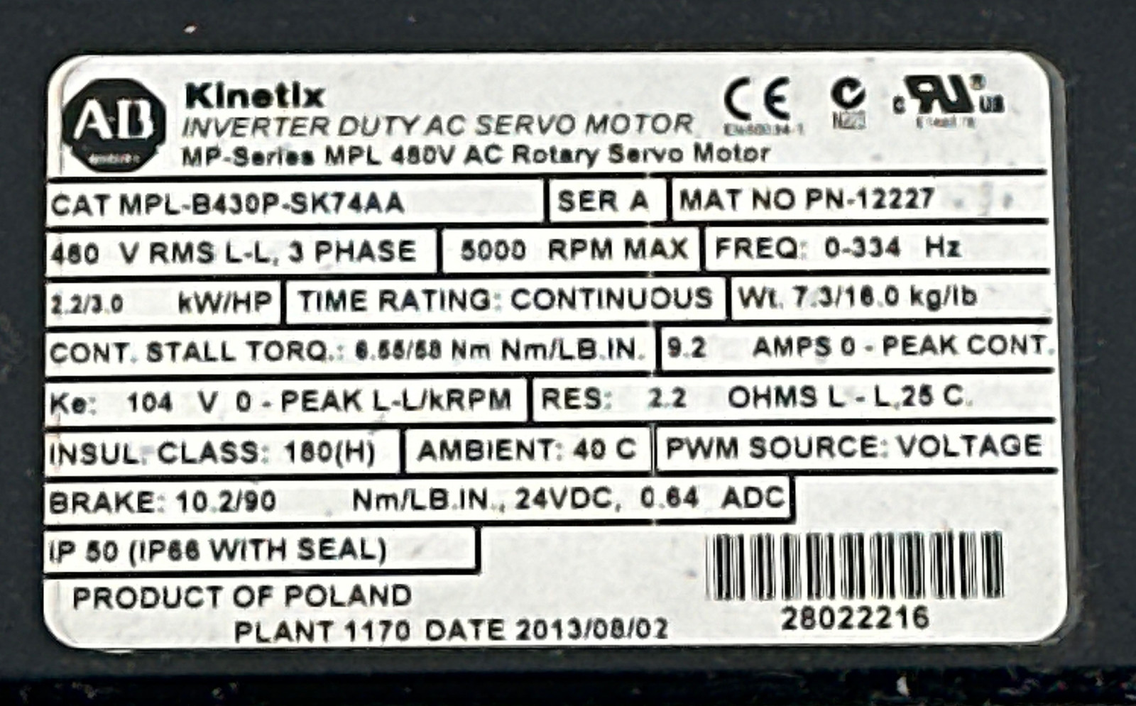 Allen-Bradley MPL-B430P-SK74AA SER.A AC Servo Motor, 3HP