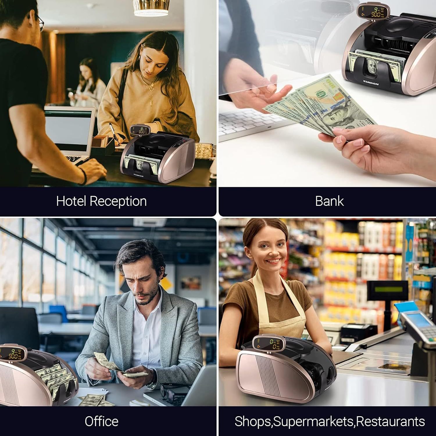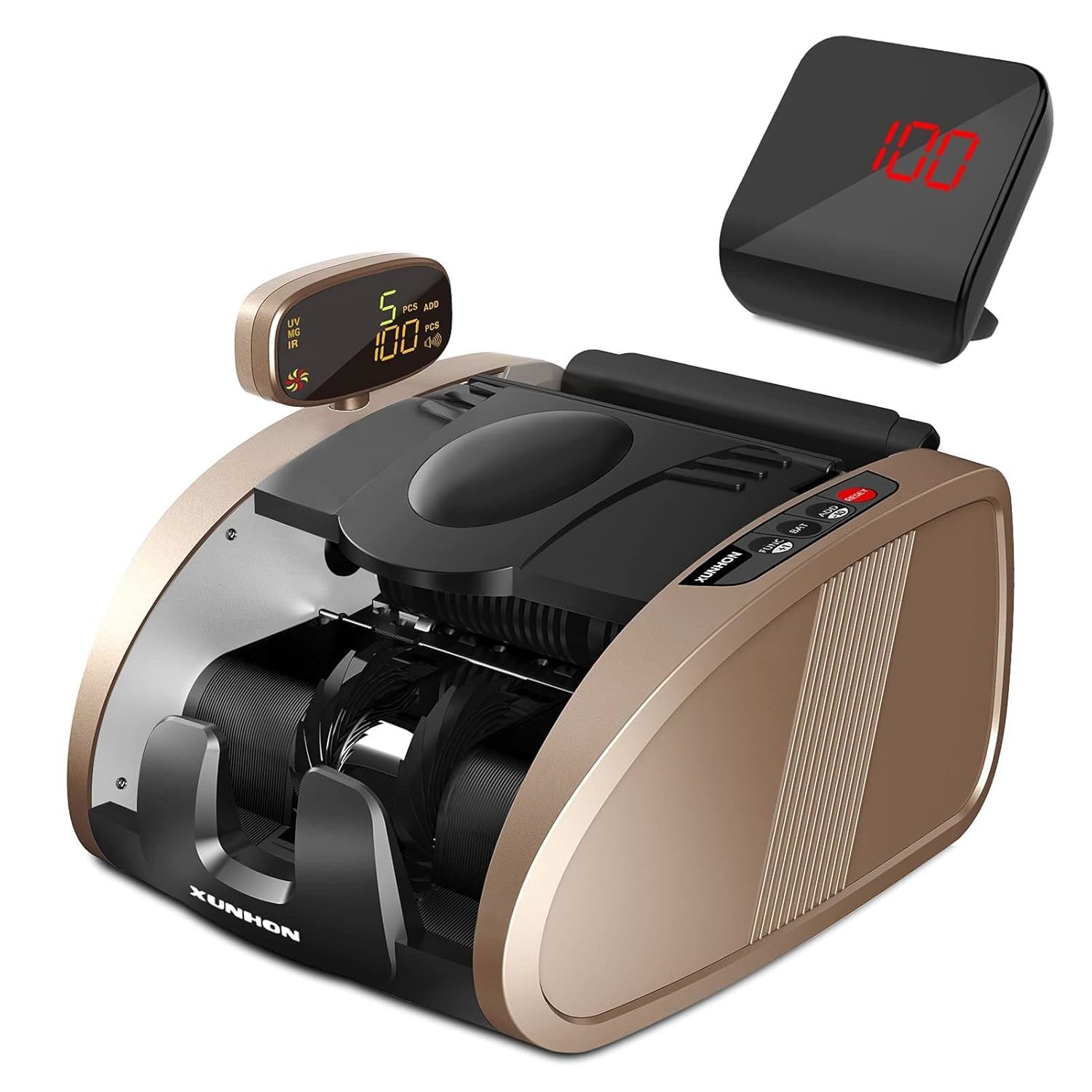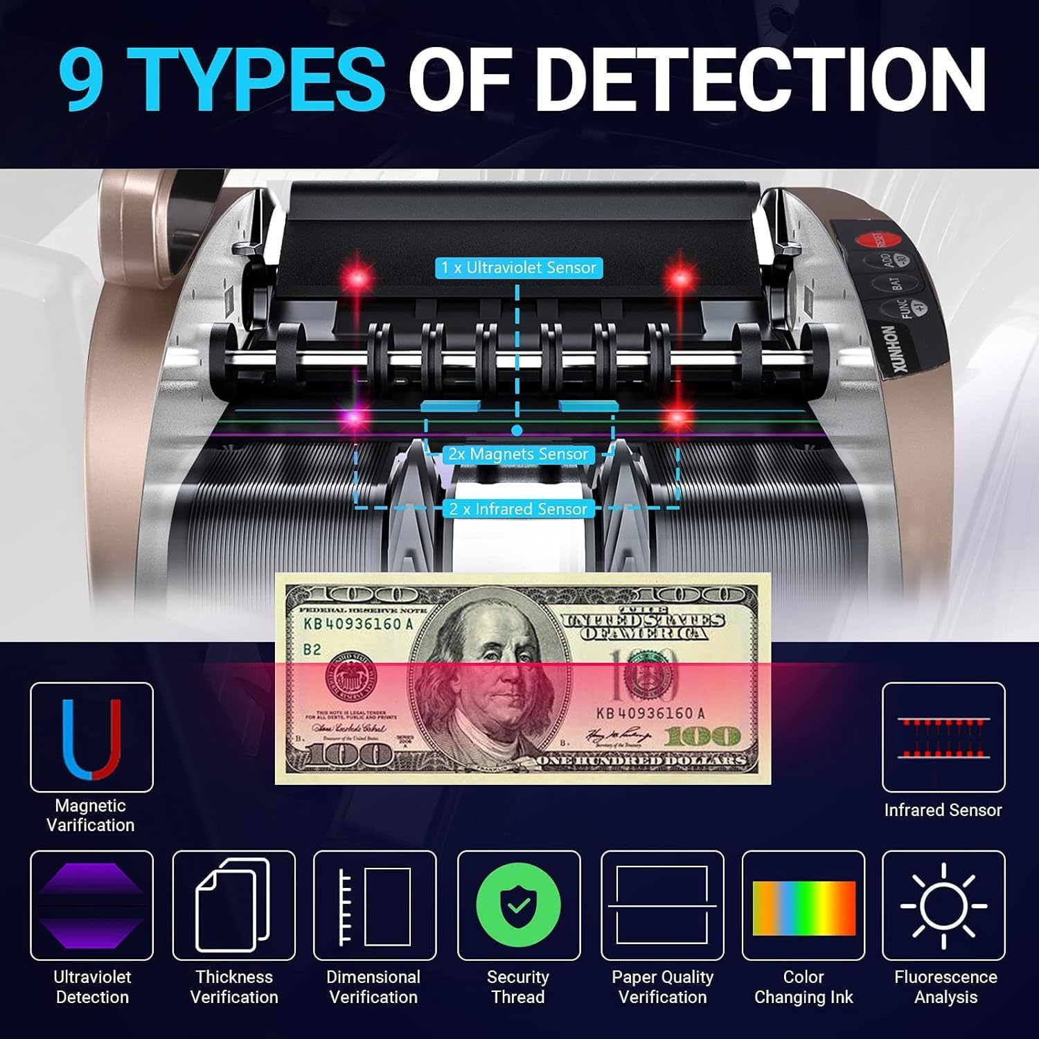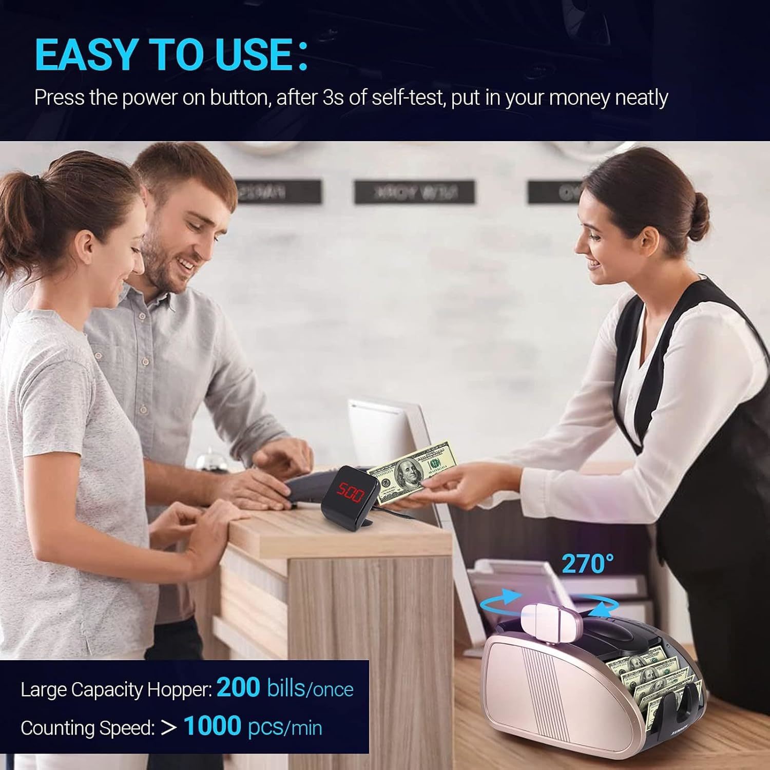 ?No Fake/Damaged Bill Anymore?As an excellent business choice for money counter and counterfeit detector, our counting machine owns 9 kinds of counterfeiting detection methods which makes counterfeit, ripped or damaged bills have nowhere to hide: Ultraviolet (UV), Infrared (IR), Magnetic (MG), Metal Thread (MT), Dimensional, Thickness, Paper Quality Verification, Fluorescence analysis and Color Changing Ink. (The money counting machine only counts the number of bills, NOT the denominations) ?Fast Speed, High Power Motor Large Hopper Capacity?Our bill counter owns the motor with higher speed and longer life, which could count more than 1,000 bills per minute. 200 hopper capacity max helps you to complete money counting faster. Besides, bigger impeller and front stacker make bill counting smoothly without jamming. ?Easy to Use with Multiple Modes?This money counter machine owns 6 different operation modes which helps you to count bills easily. Count, add, and batch modes make money counting never so efficient. No matter what you want - counting or detecting or distributing bills - our bill counter is perfect for your needs, and these models are very easy to operate. ?2 Large Displays?This bills counting machine is equipped with 2 large displays: a 270 rotatable LED display and an external display. These easy to read screens could provide accurate, immediate and clear counting result for you and clients. The tracking of bill counts and operating modes would be more easier. A hidden handle on the top of the wireless money counter machine takes you convenience and comfort.
